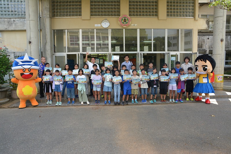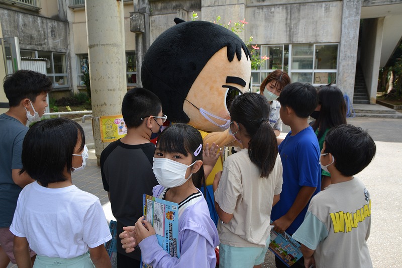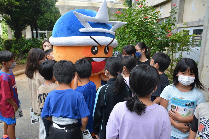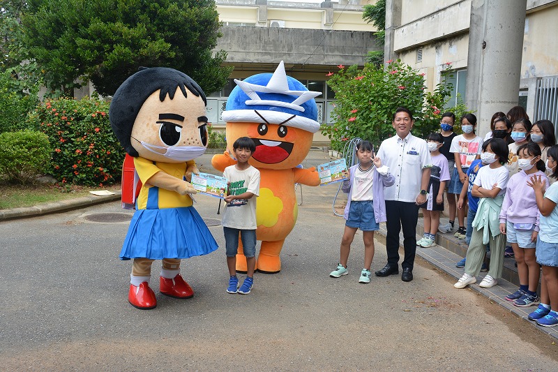 そこで子供達へ、松本市長、てだ子、うらちゃんが直接下敷きを配布しました。(てだ子とは※”てだ子”の活動日記)