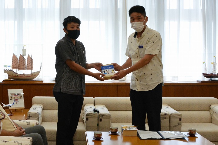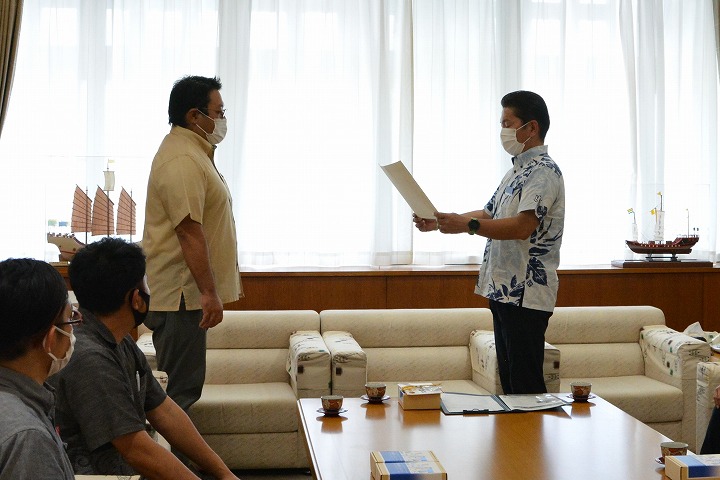 令和4年6月29日(水曜日) 浦添市役所の市長応接室にて、有限会社沖縄クリーン工業様より、浦添市企業版ふるさと納税(浦添市まち・ひと・しごと創生寄附金)の贈呈式が執り行われました。
