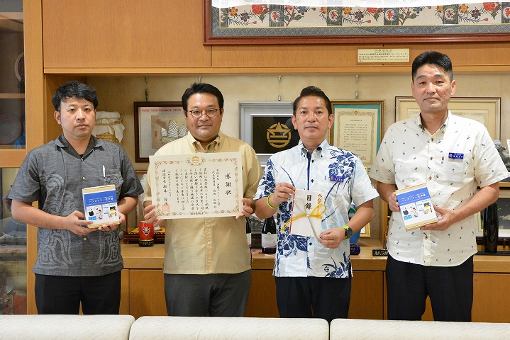 頂戴した寄附金につきましては、有限会社沖縄クリーン工業様がご指定された「出産、子育てにやさしく、健康に過ごせるまちを目指す事業」の財源として活用させていただきます。
