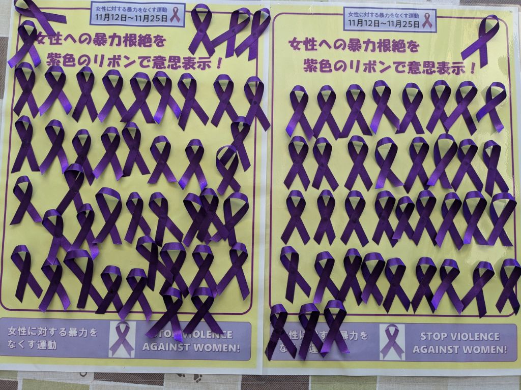 パープルリボンは女性に対する暴力根絶のシンボルです。
