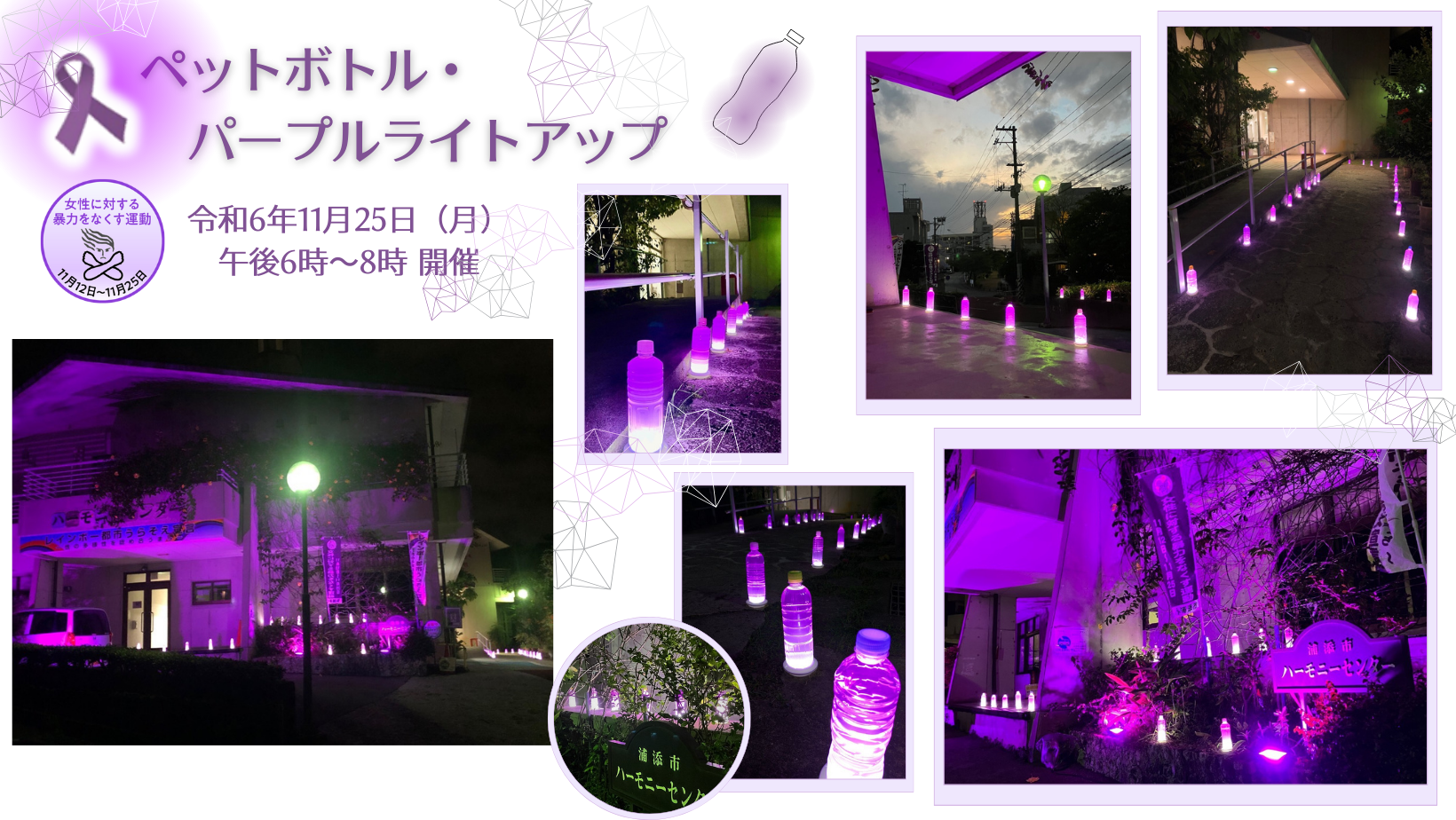 昨年度は11月12日から25日までの2週間、ハーモニーセンターを紫色にライトアップをしましたが、ご覧になりましたか。ライトアップの最終日である11月25日は「女性に対する暴力撤廃国際日」。ペットボトルを使用したパープルライトアップも同時開催し、センターが紫色に染まりました。