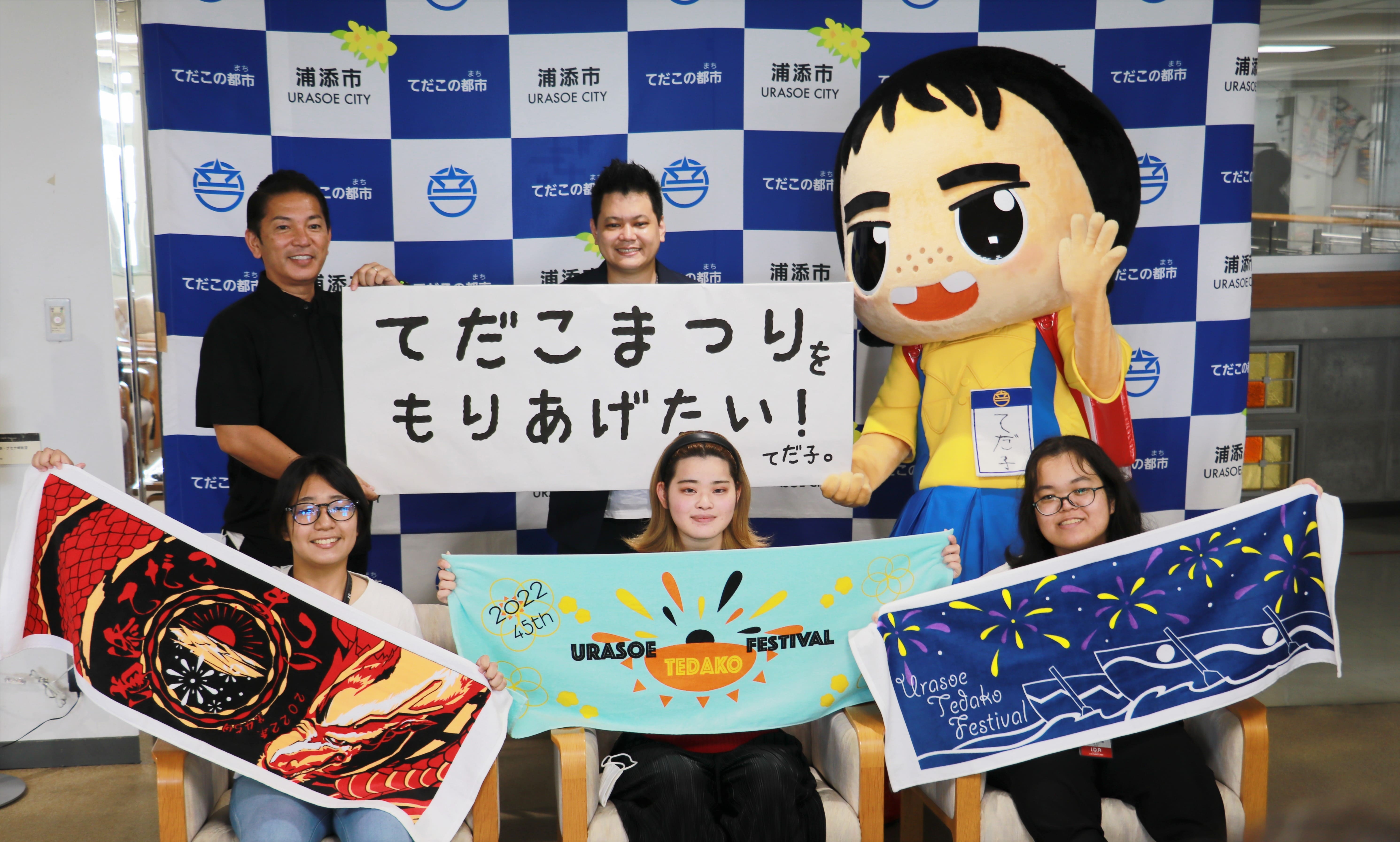商品化されたてだこまつりタオルをデザインした専修学校I.D.Aの学生3名が出席し、てだこまつり実行委員長(浦添市長)から感謝の言葉と共に、表彰状とそれぞれがデザインしたタオル等が贈られました。