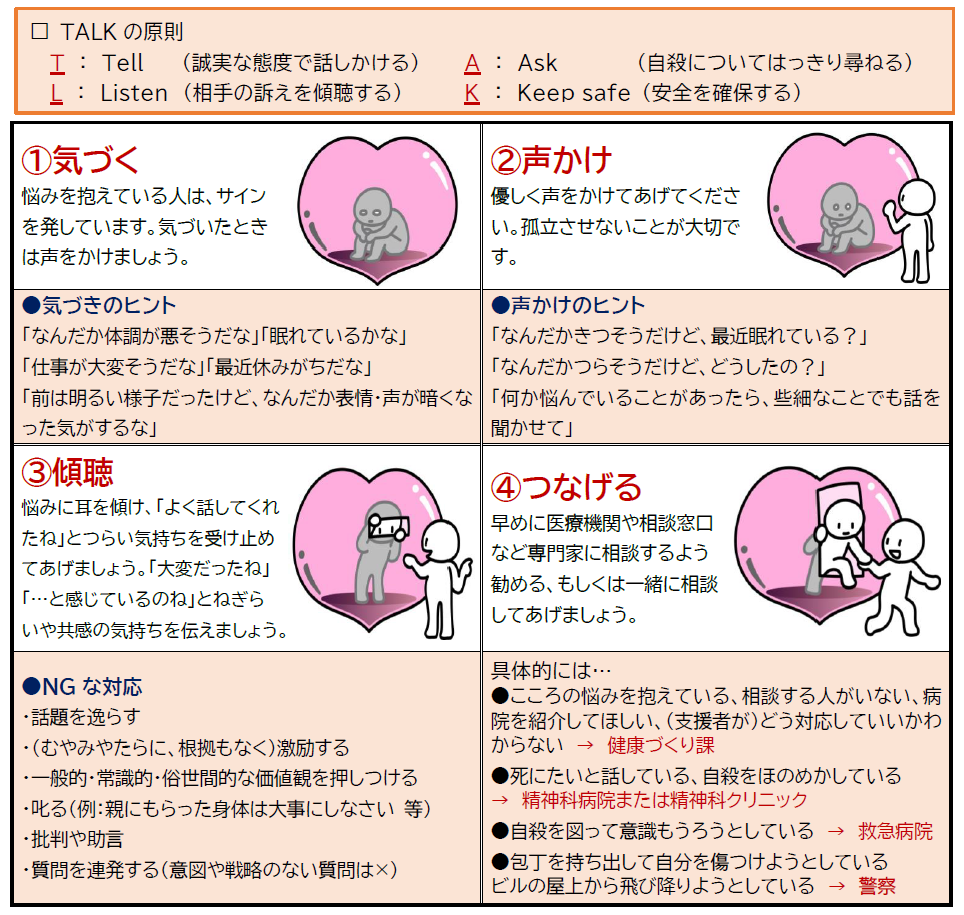 身近な悩んでいる人に寄り添い、関わりを通して「孤独・孤立」を防ぎ、支援することが重要です。