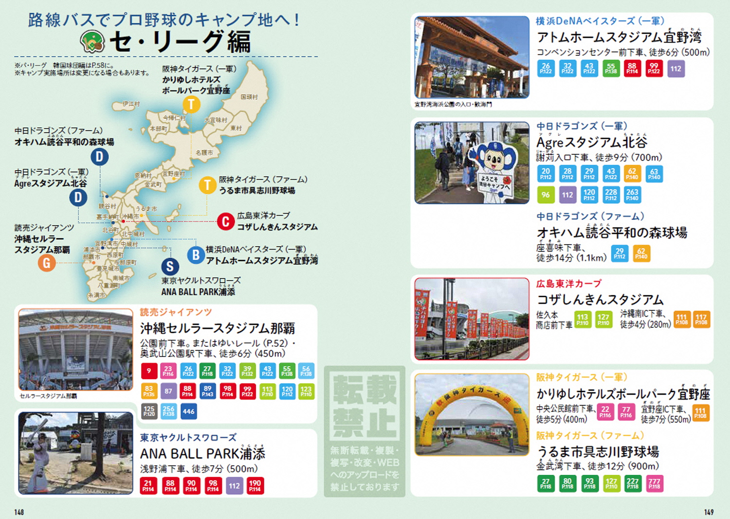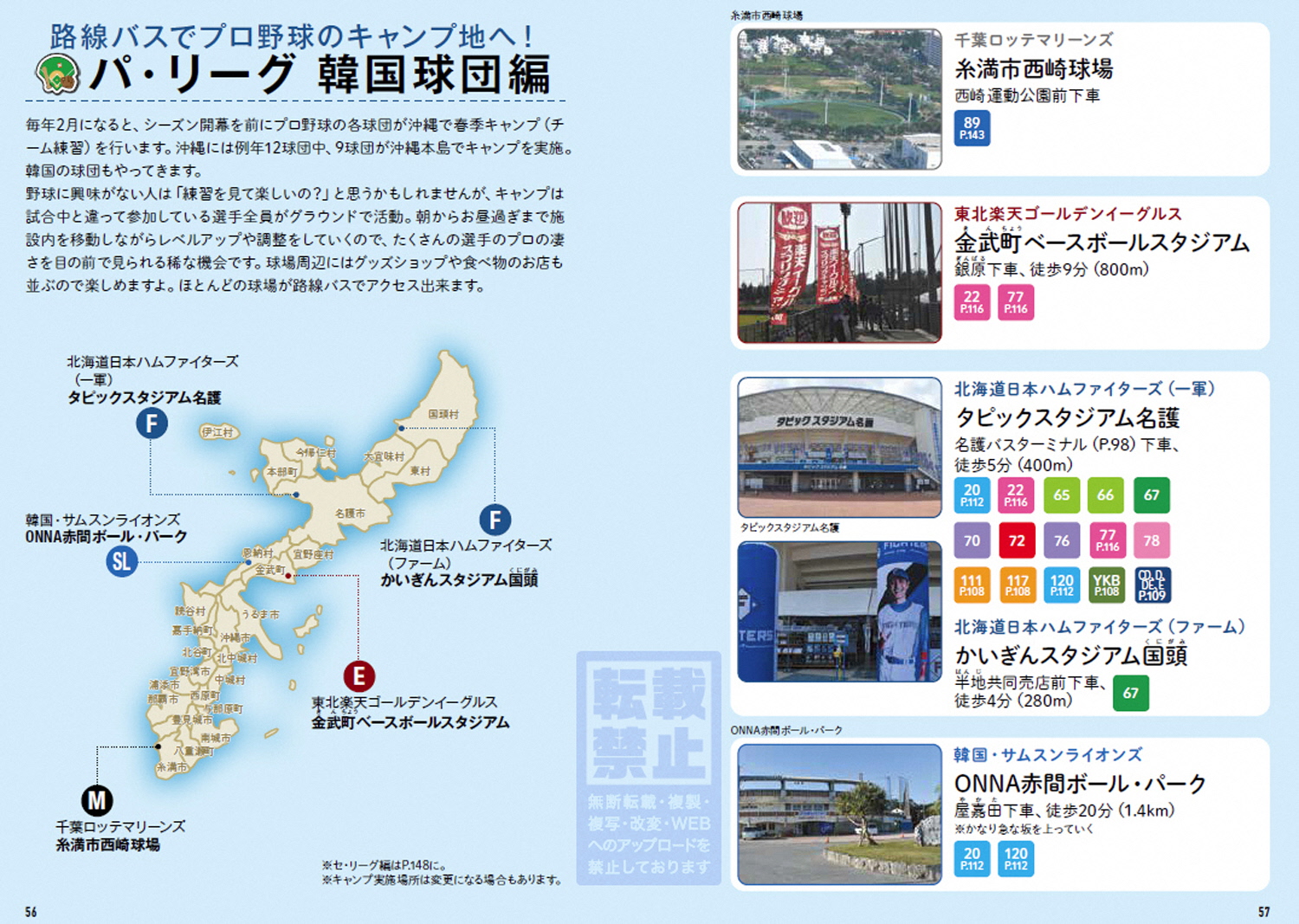 こちらのガイドブックは著者の室井氏が、沖縄県で行われるプロ野球のキャンプ地へ取材訪問する際に、路線バスを利用し続けた中で、「誰でも気軽にバスに乗れるように」と独自で主要停留所発着のルート表を作成し、「バスマップ沖縄」の谷田貝氏と手を組みながら製作された、観光客だけでなく地元の人たちにも便利な「乗客目線のガイド本」となっています。