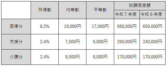 令和7年度から、医療分及び支援分の賦課限度額が変更になります。令和7年度国民健康保険税の税額及び税率は、次の表のとおりです。