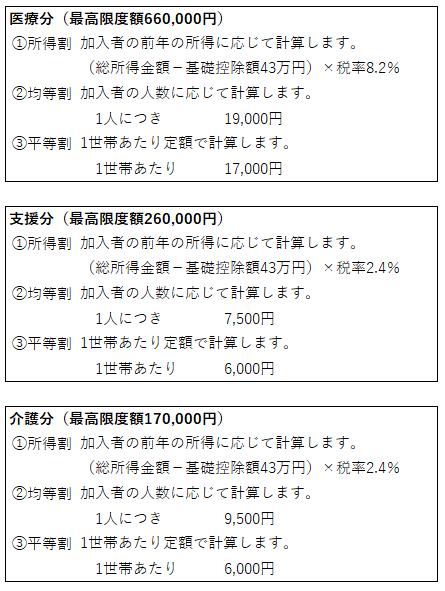 国民健康保険税は、医療分・支援分・介護分の金額をそれぞれ計算し、それらを合計した金額です。