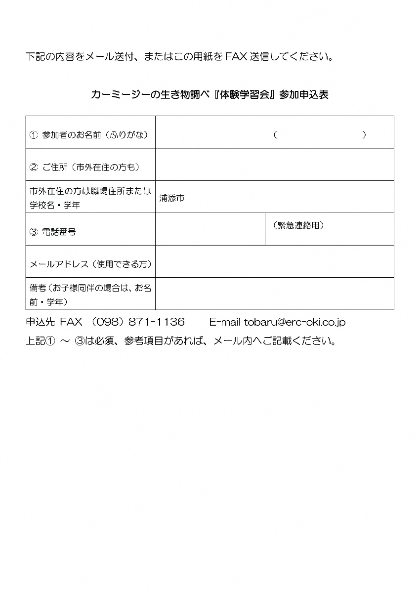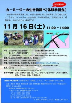 浦添市では、市民の皆様と共に自然再生に取り組むために、今年もカーミージーの生き物調べ「体験学習会」 を開催します。経験者も、初めての方も大歓迎です。