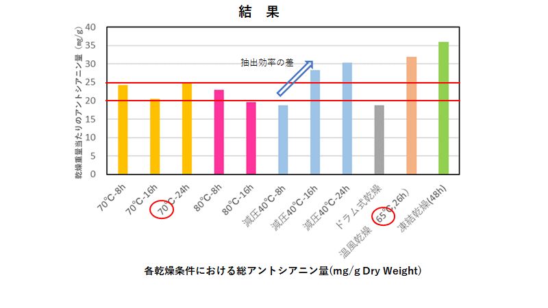 ③有効成分のアントシアニンを出来るだけ保持させるためには、温度は40~65℃程度、できれば減圧下での乾燥が適していると分かった。