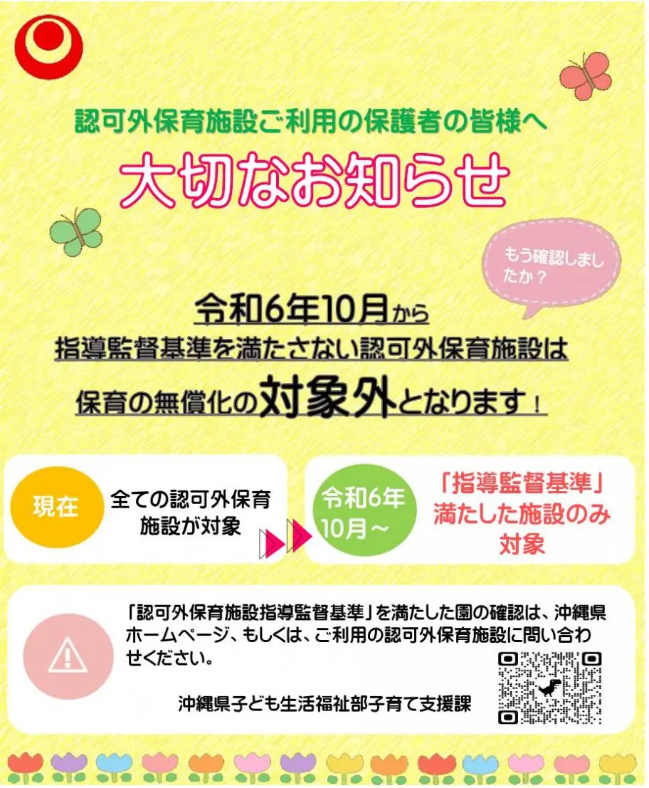 なお、毎年度、施設には県が立ち入り調査を実施しており、現在基準を満たしていた場合でも、立ち入り調査等により基準を満たしていないことが明らかになった場合は、基準を満たすようになるまで無償化の対象外施設となりますのでご理解いただきますようお願いします。