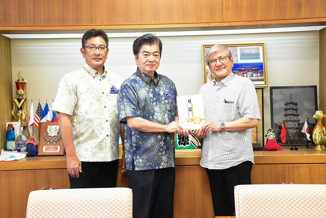 当市議会では、アメリカ合衆国ハワイ州マウイ島における火災で被災された方々への支援を行うことが議会運営委員会で決定されました。議員から支援金を募り集まった寄付金は沖縄ハワイ協会のちむぐくるプロジェクトを通じて支援を行うことになり、市議会を代表し正副議長より沖縄ハワイ協会の大城会長へ支援金26万円の贈呈を行いました。