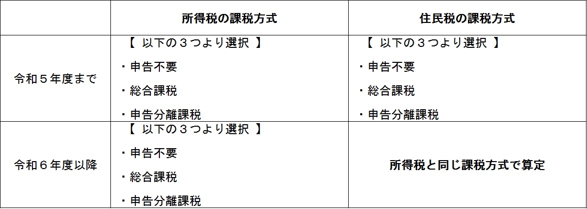 上場株式等の配当所得等については、所得税と個人住民税において異なる課税方式の選択が可能とされてきましたが、令和6年度以降は所得税と課税方式を一致させることとなり、異なる課税方式が選択できなくなります。