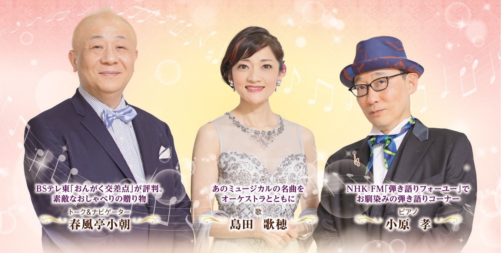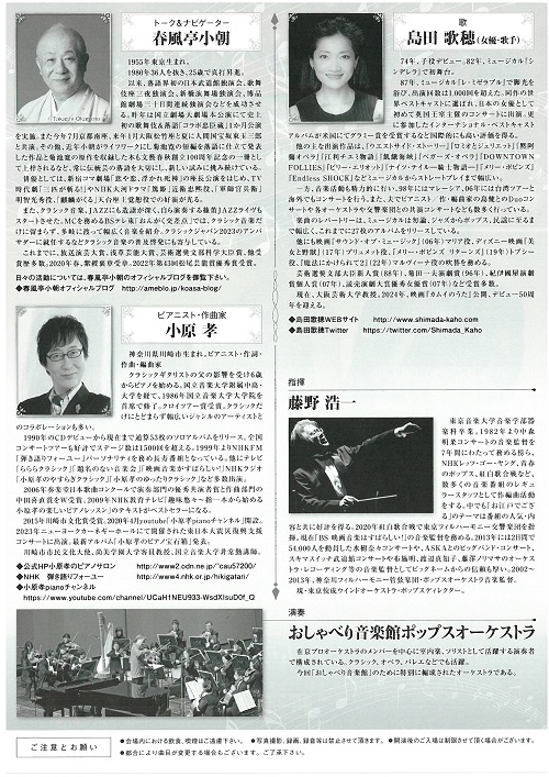 春風亭小朝の楽しいトークコーナーや小原孝の弾き語りコーナーもあります。