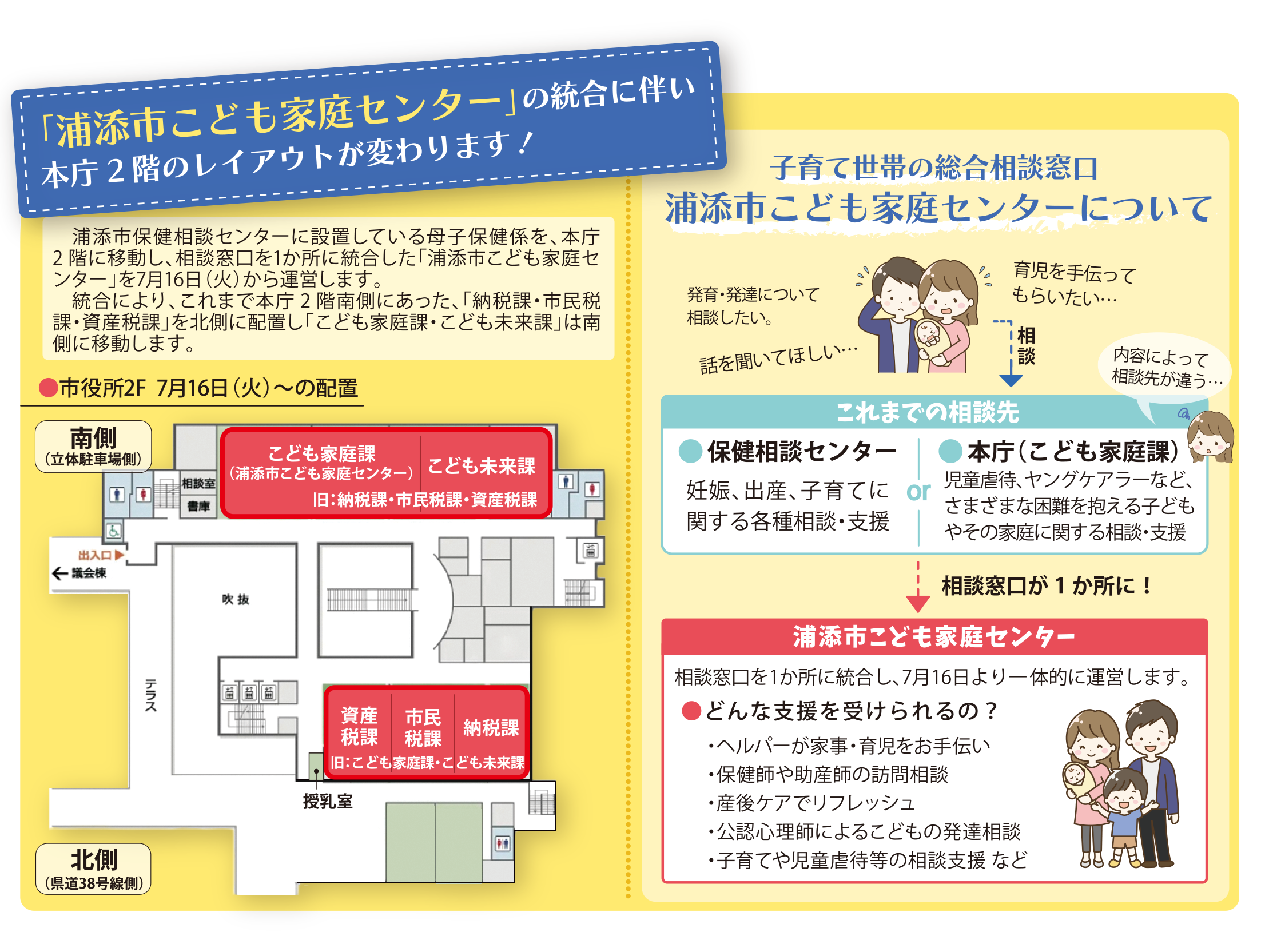 ※当面は上記二箇所での相談対応となりますが、令和6年7月16日以降は、市役所本庁舎2階にて「児童福祉」と「母子保健」一体的相談窓口を設置いたします。