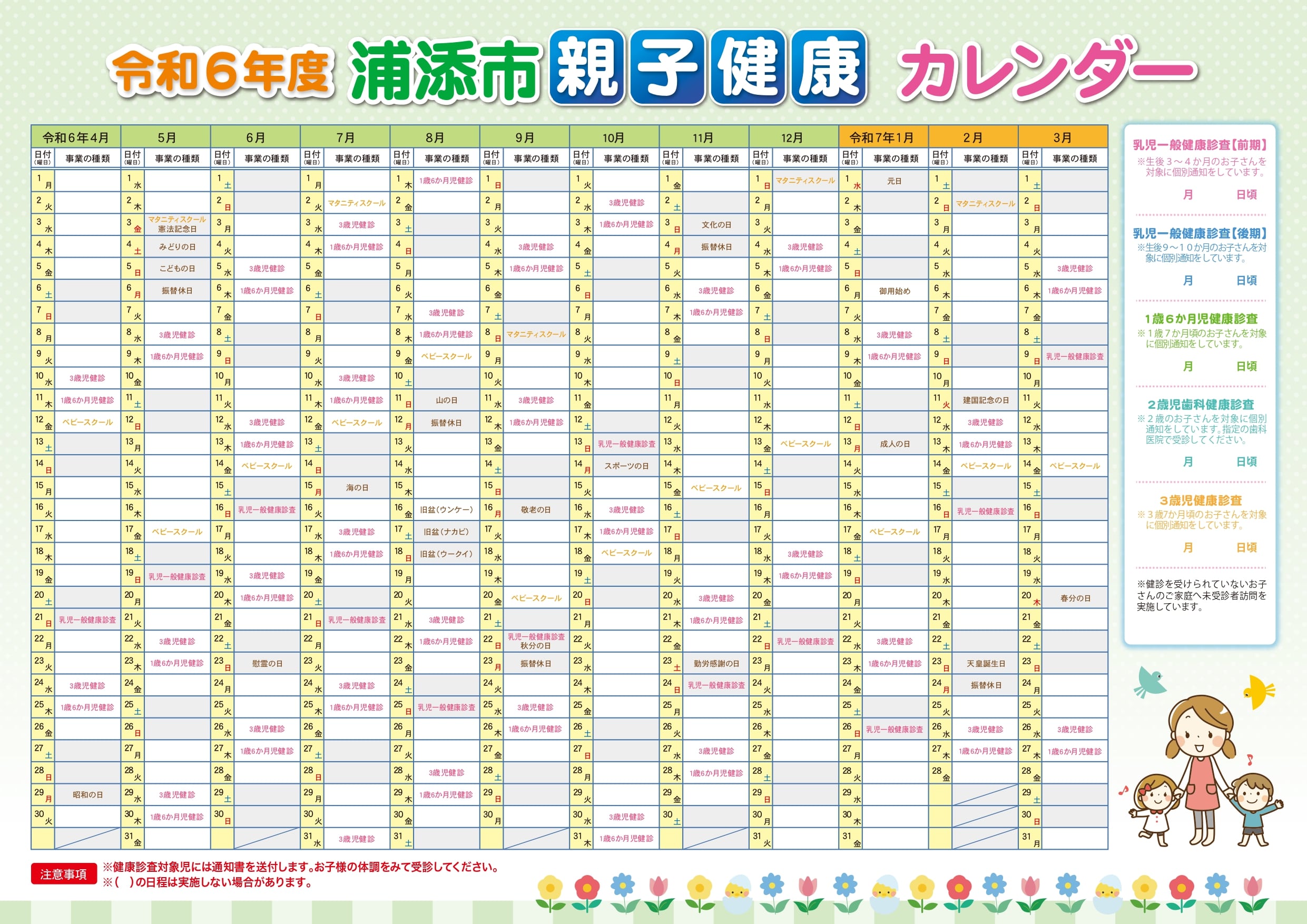 浦添市の令和6年度母子保健事業の年間スケジュールです。保健相談センターで実施しているスクールや乳幼児健診などが確認できます。