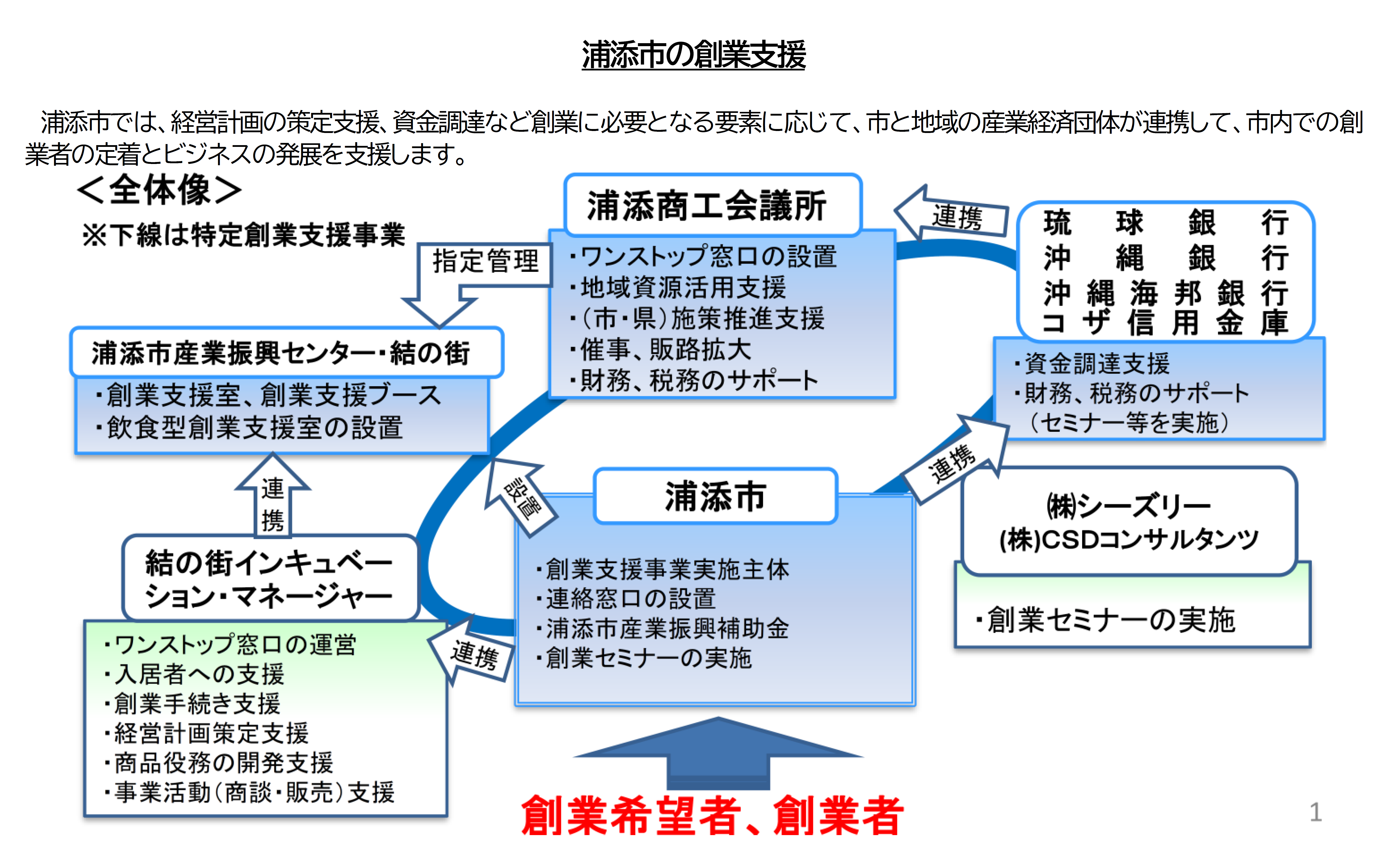 浦添市は、市内における創業を促進するため、浦添商工会議所や地域金融機関との連携により、創業支援に関する事業を計画化し、産業競争力強化法の規定に基づく創業支援事業計画として、平成27年5月20日付で国から認定を受けました。