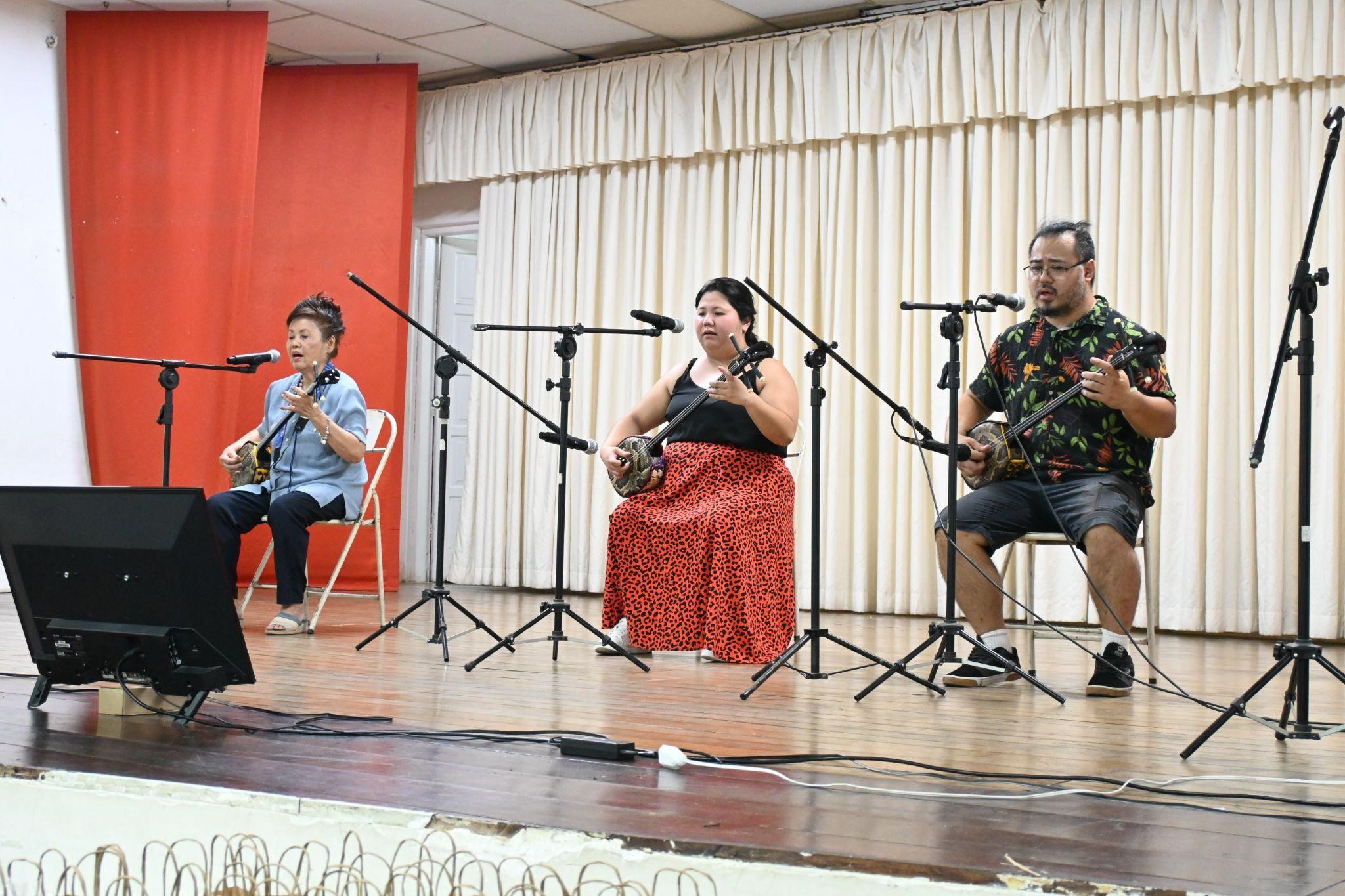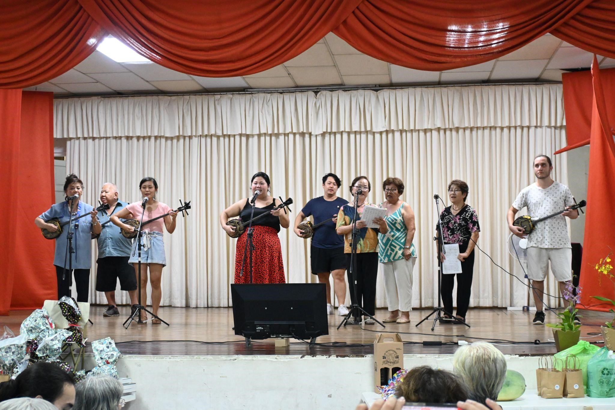 三線の別のパフォーマンスも行われました。「安里屋ユンタ」と「てぃんさぐの花」の曲を皆さんが演奏し、歌いました。ギターと三線の音色に合わせて、ブラジル音楽も演奏されました。