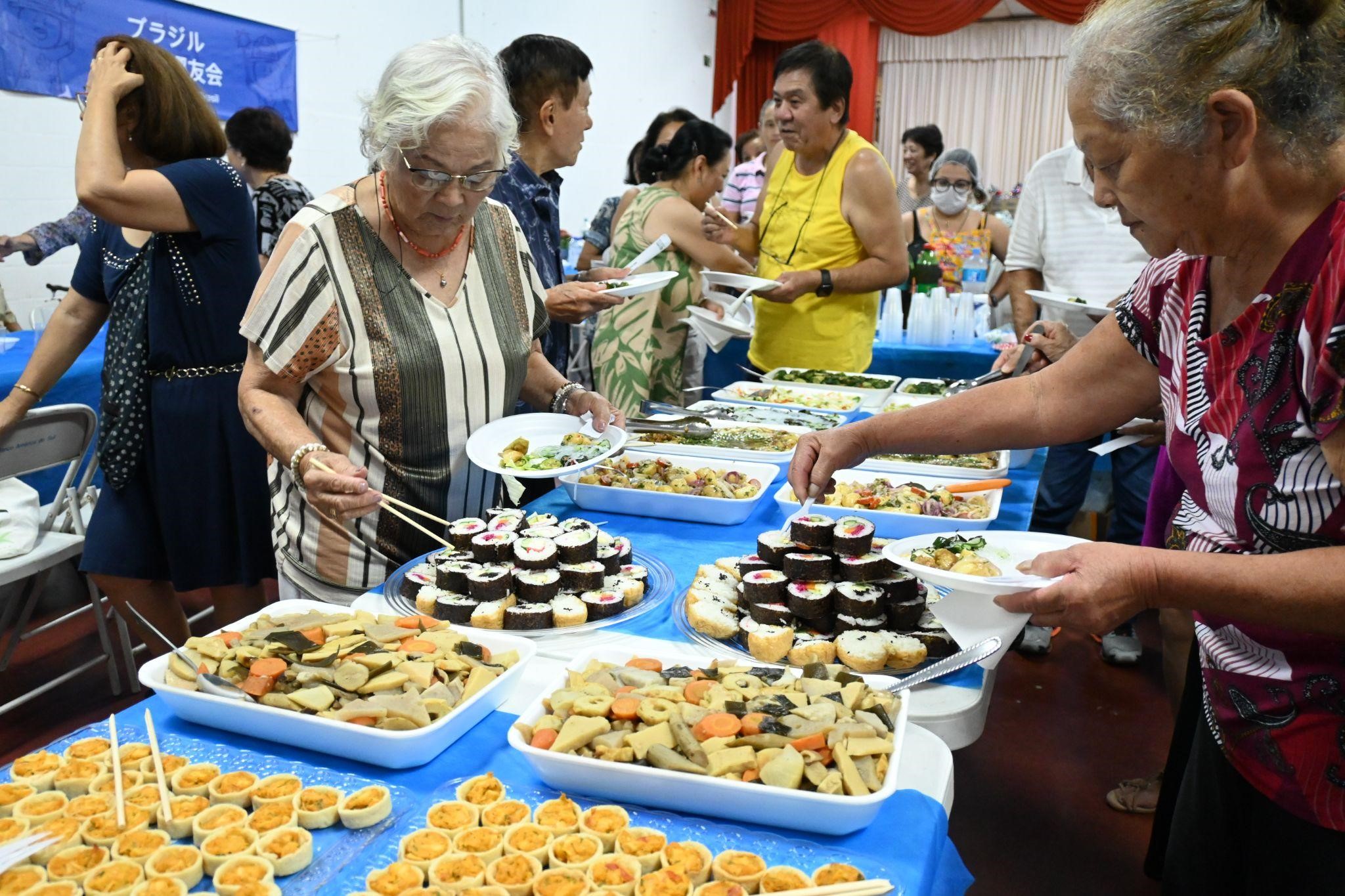 イベントが始まると、食べ物が提供されました。ブラジル料理と日本の料理を組み合わせて、ご馳走が多くありました。例えばいなり寿司と巻き寿司と煮しめとはるさめと焼きまんじゅうとサーターアンダギーでした。サーターアンダギーの味はとても美味しくて、沖縄で食べたものを思い出させる味だったのですよ!