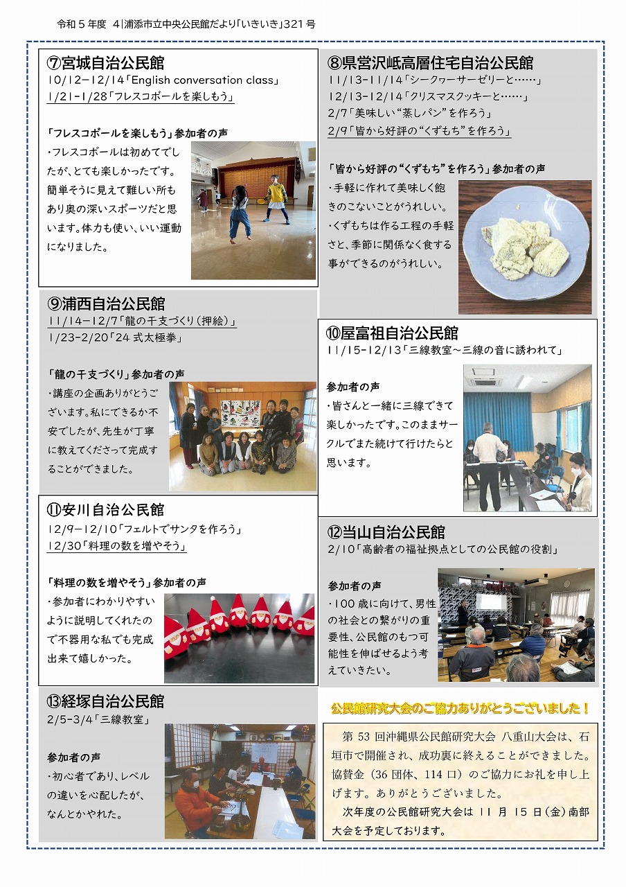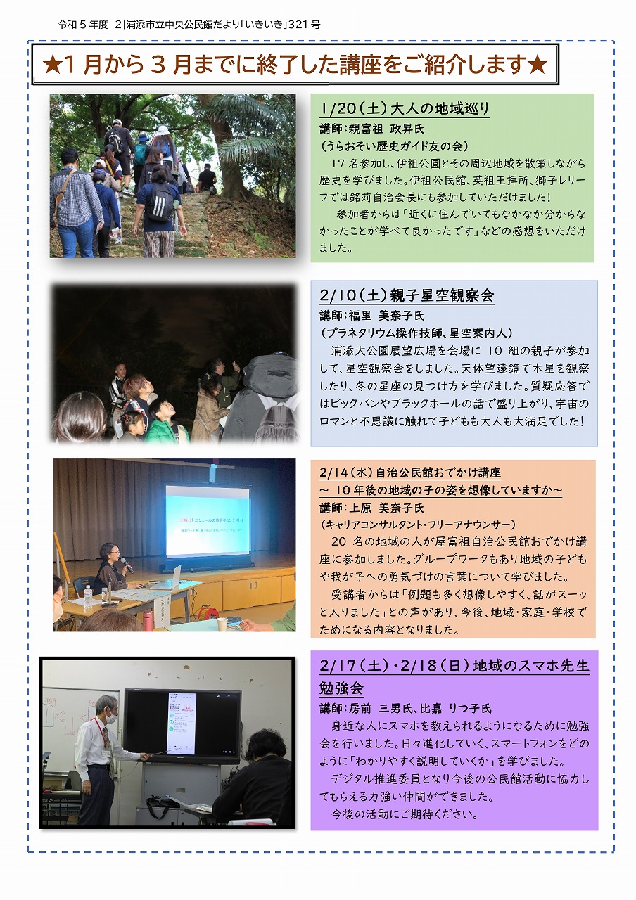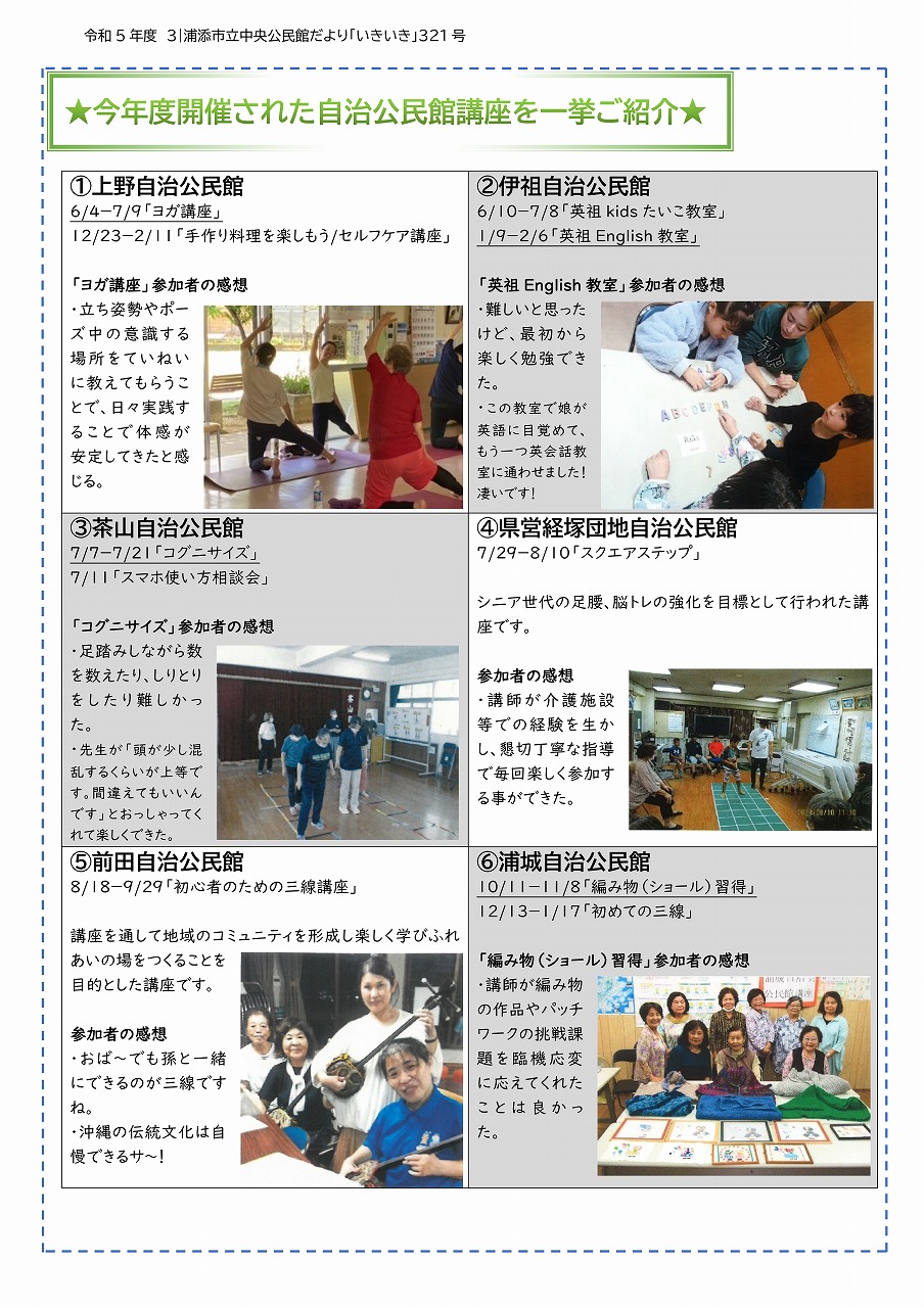 公開日 1900年01月01日 更新日 2024年03月31日 令和5年 浦添市立中央公民館だより「いきいき」第321号を発行しました! ぜひご一読ください! 中央公民館トップページへ戻る この記事に関するお問い合わせ 教育委員会教育部 浦添市立中央公民館郵便番号:901-2103住所:沖縄県浦添市仲間1-1-2 あかひらステーションビル1階TEL:098-879-5503FAX:098-879-5530お知らせ:問い合わせメールはこちら