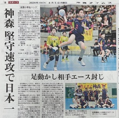 8月4日(日)、第37回全国小学生ハンドボール大会(京都府)に出場している神森ハンドボールクラブが決勝まで勝ち進み、見事優勝し全国制覇を成し遂げました。日本一です。おめでとうございます。これまでご指導していだだきました翁長誠光監督をはじめ、コーチ陣の皆様、子ども達を支えてくれた父母会や関係者の皆様にも感謝いたします。ありがとうございました。神森ハンドボールクラブの選手の皆さん、これまで本当によく頑張りました。胸を張って沖縄へ帰ってきてください。8月5日(月)の沖縄タイムス新聞に掲載されました!!