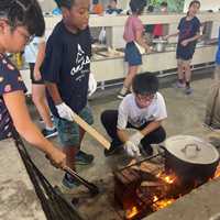 自然教室に参加している5年生、班ごとに別れ男女協力しながら野外炊飯にチャレンジしました。各々の役割を責任をもって活動しました。できあがったカレーライスはおいしくいただきました。