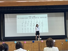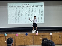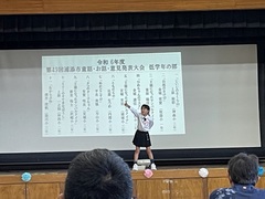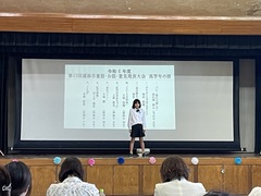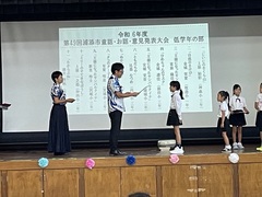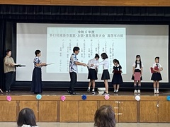 本日、令和6年度浦添市童話・お話会が浦添中央公民館で行われました。本校から低学年部に上原 結彩(3年生)さんと高学年の部で上原 愛央さん(5年生)が神森小学校の代表として発表してくれました。二人とも落ち着いて堂々と発表をしてくれました。