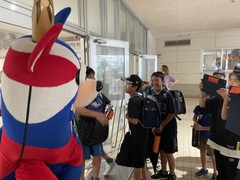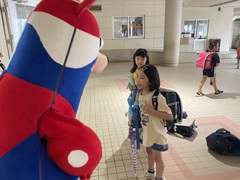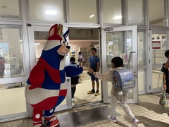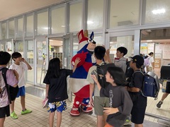 本日の朝、神森小学校にプロバスケットチーム琉球キングスのキャラクター、ゴーディーが朝の挨拶運動をしてくれました。児童玄関前では、ゴーディーのまわりを神森っ子が「おはようございます」と挨拶してくれました。挨拶は人と人を繋ぐ架け橋です。これからも進んで挨拶しましょう。ゴーディー、神森小学校に来てくれてありがとうございました。