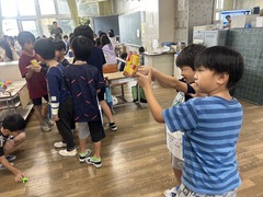 本日、1年生と2年生が一緒になり「おもちゃ祭り(生活科)」を行いました。「これ、こうやるんだよ」と2年生が1年生へ手作りのおもちゃで遊ばせてくれました。どの子も笑顔が絶えず「楽しい!」という声でいっぱいでした。