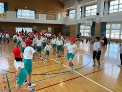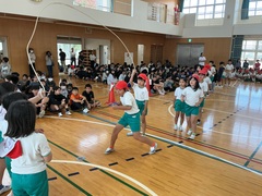 本日の5校時、本校体育間において「大縄跳び大会」を開催しました。本校では、体力向上の一環として日頃から「縄跳び」に取り組んでいます。今日は、その成果を発揮する場として、学級全体で心を一つにした大縄跳びにチャレンジしました。1年生から6年生まで、それぞれが目標回数を目指し、心を一つ「ハイハイ!」「1、2,3!」と元気なかけ声を合わせながら、会場からの声援受けて一生懸命跳びました。学年を問わず、団結して取り組む姿がとても印象的でした。