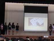 「図書委員会」は、動画で仕事内容の紹介や説明、イベント(毎月)をお知らせするとともに、本に親しめるように創意工夫していることを発表しました。