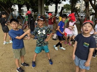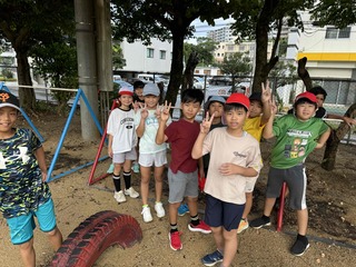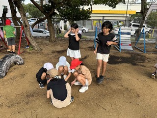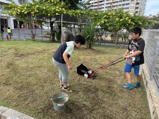 朝の活用、四年生が毎朝運動場周辺を清掃しています。