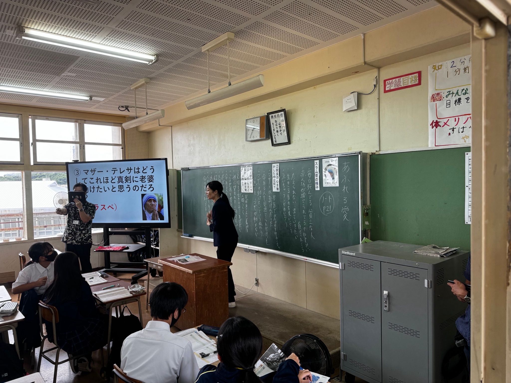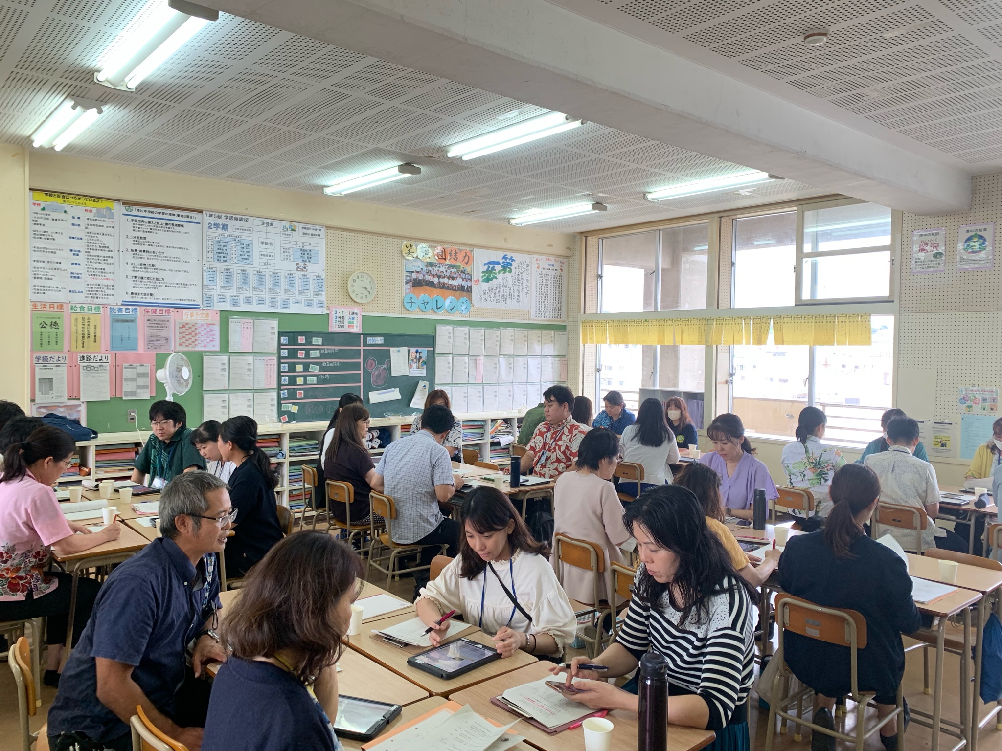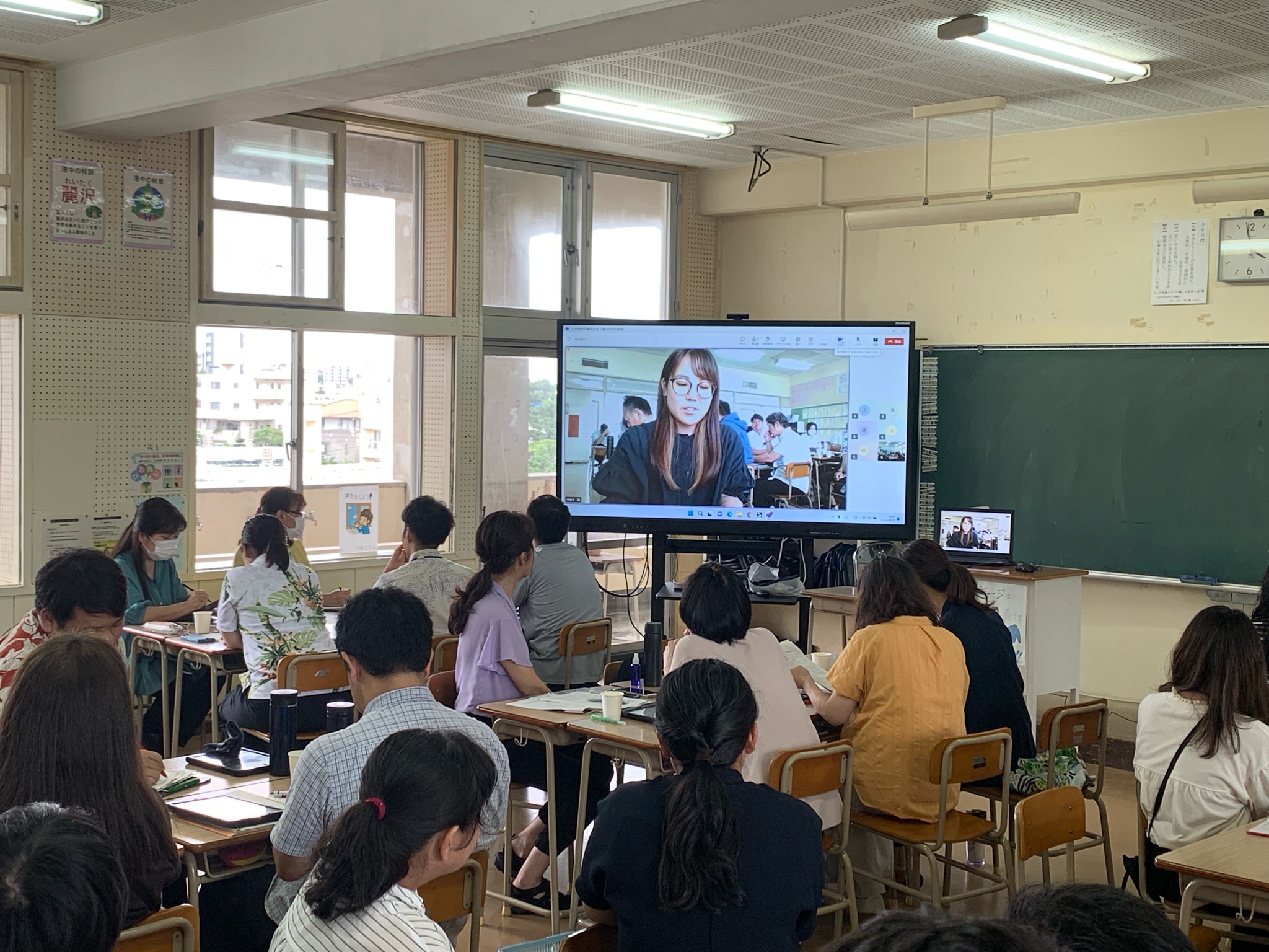 港川中・港川小・牧港小の先生方、約100名ほどが集まり、1年6組の道徳の授業を参観、