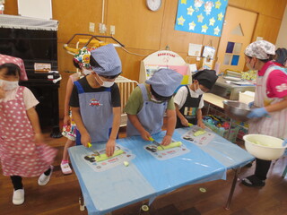 ほし組さんは、ナス、オクラ、ヘチマを器用に包丁を使ってカットしましたよ。