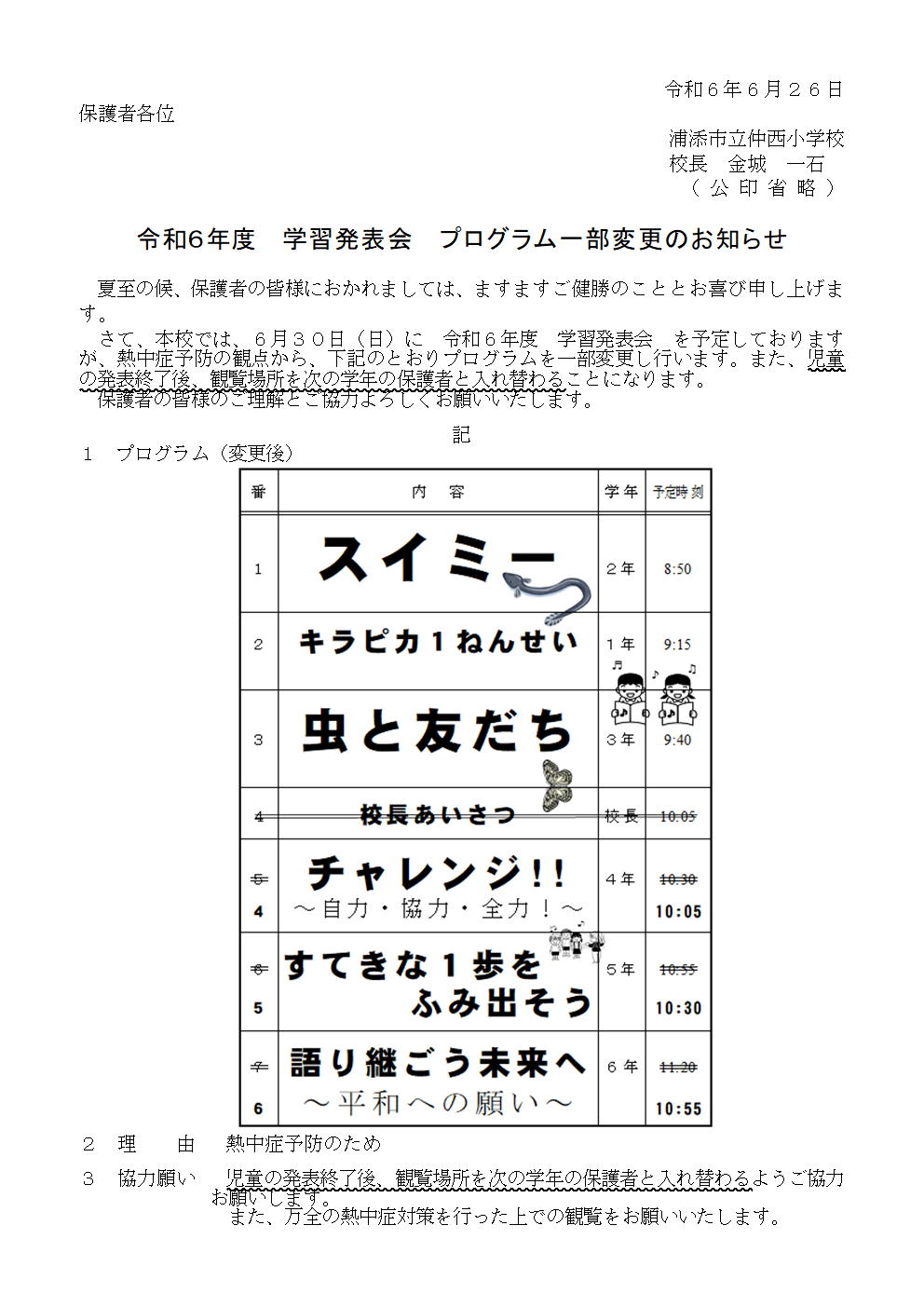 【6.6.26】令和6年度 学習発表会 プログラム一部変更のお知らせ