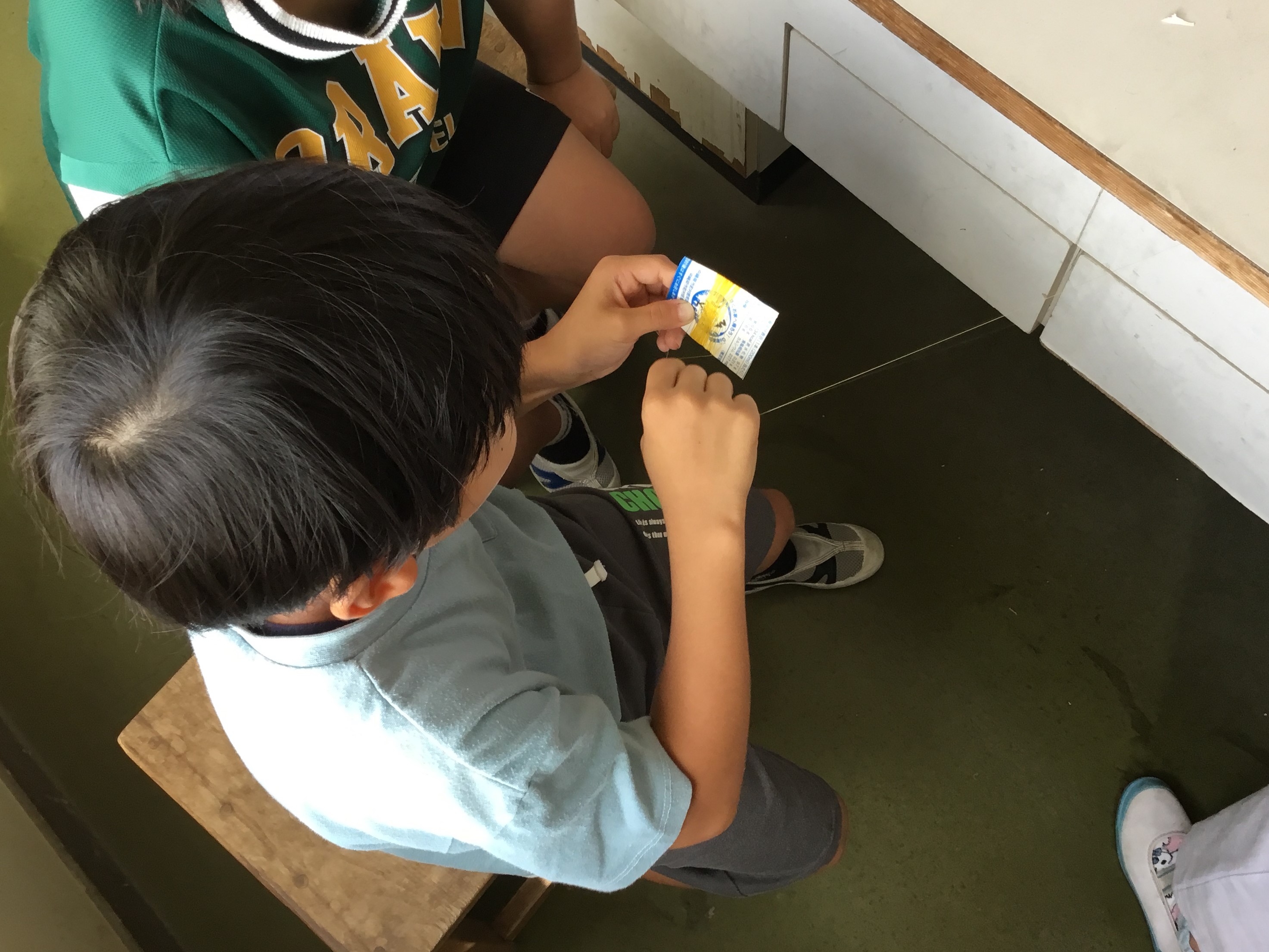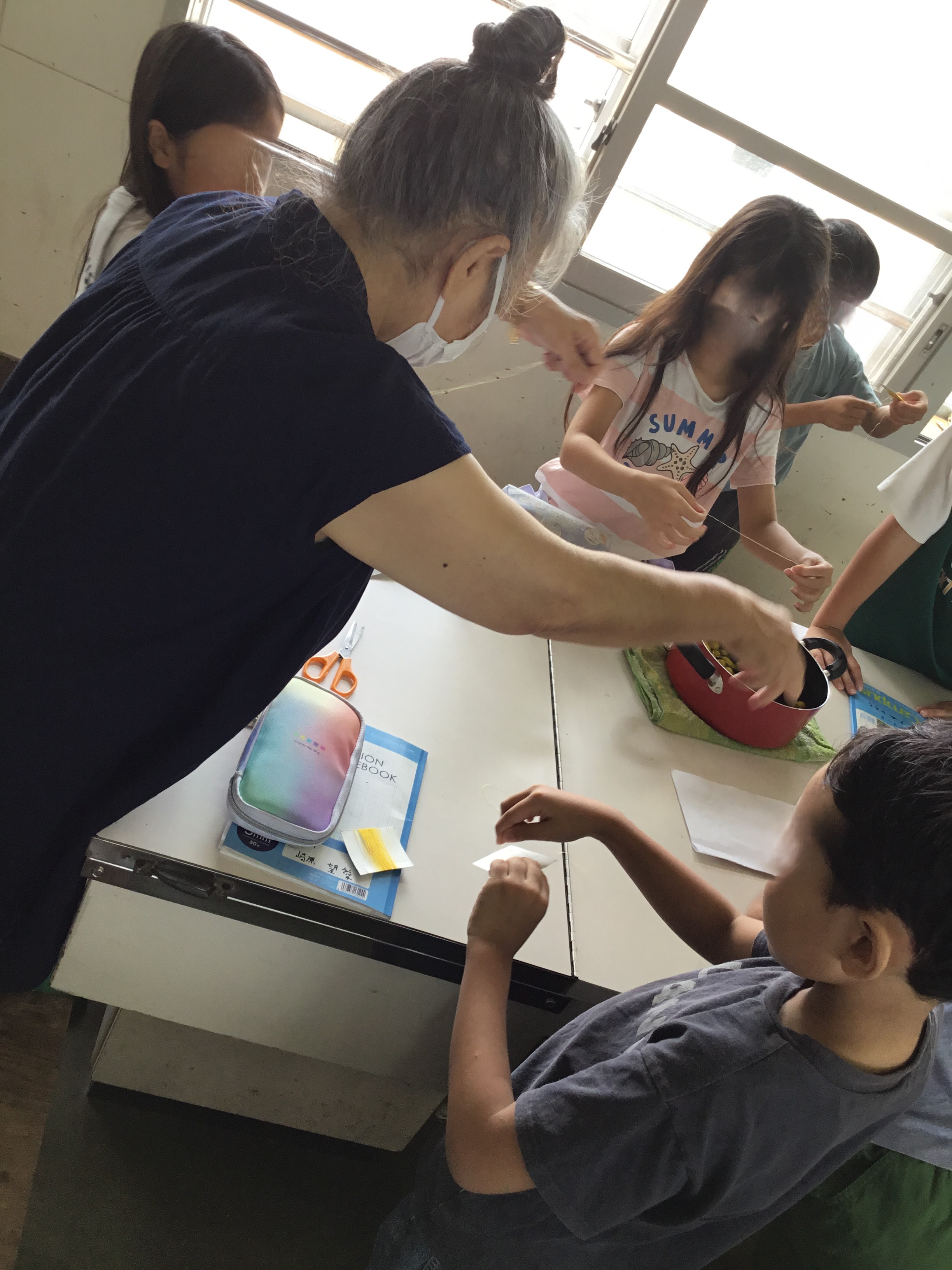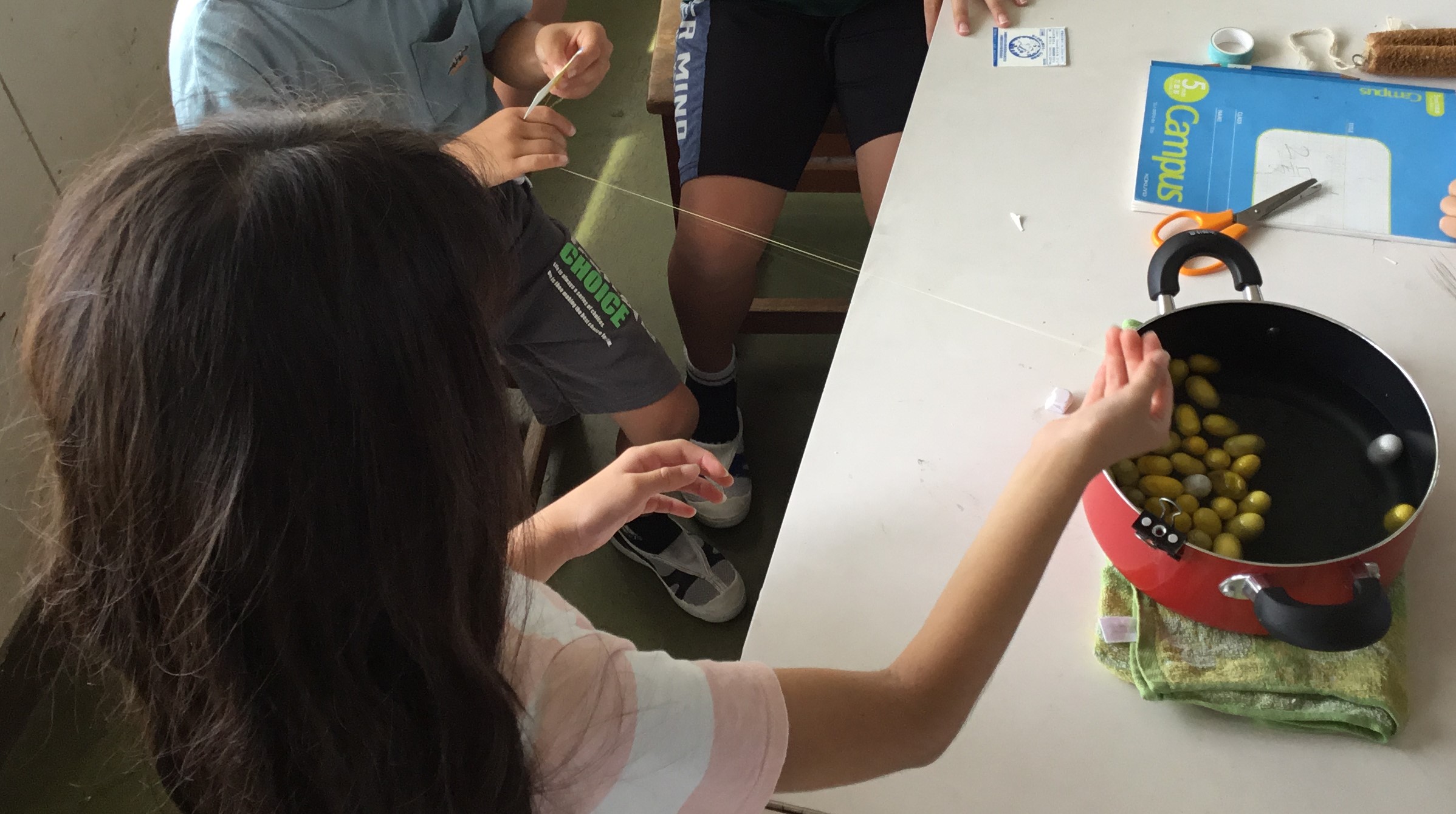 3年生が育てたカイコが作ったまゆから、糸をひく体験を行っています。