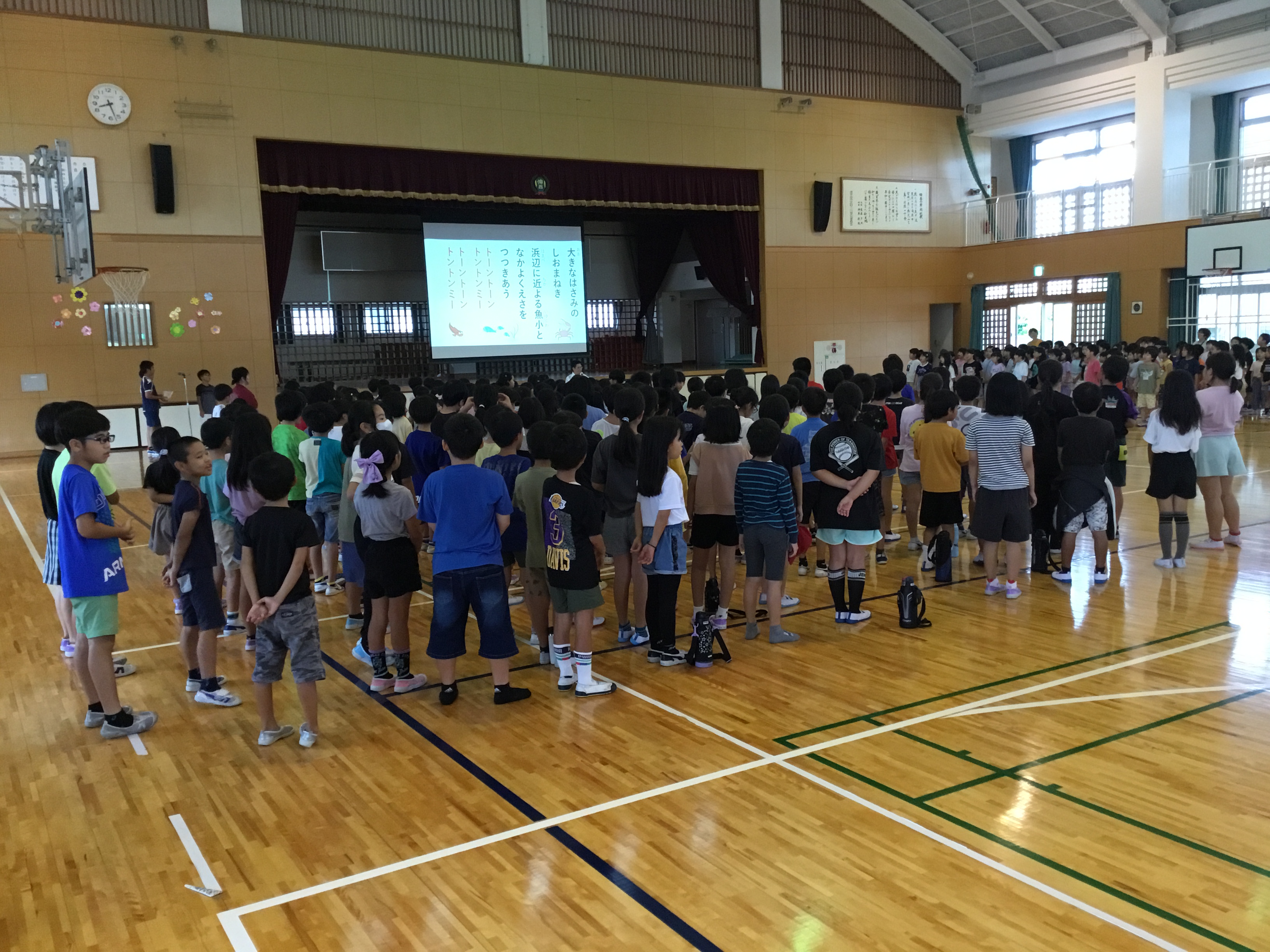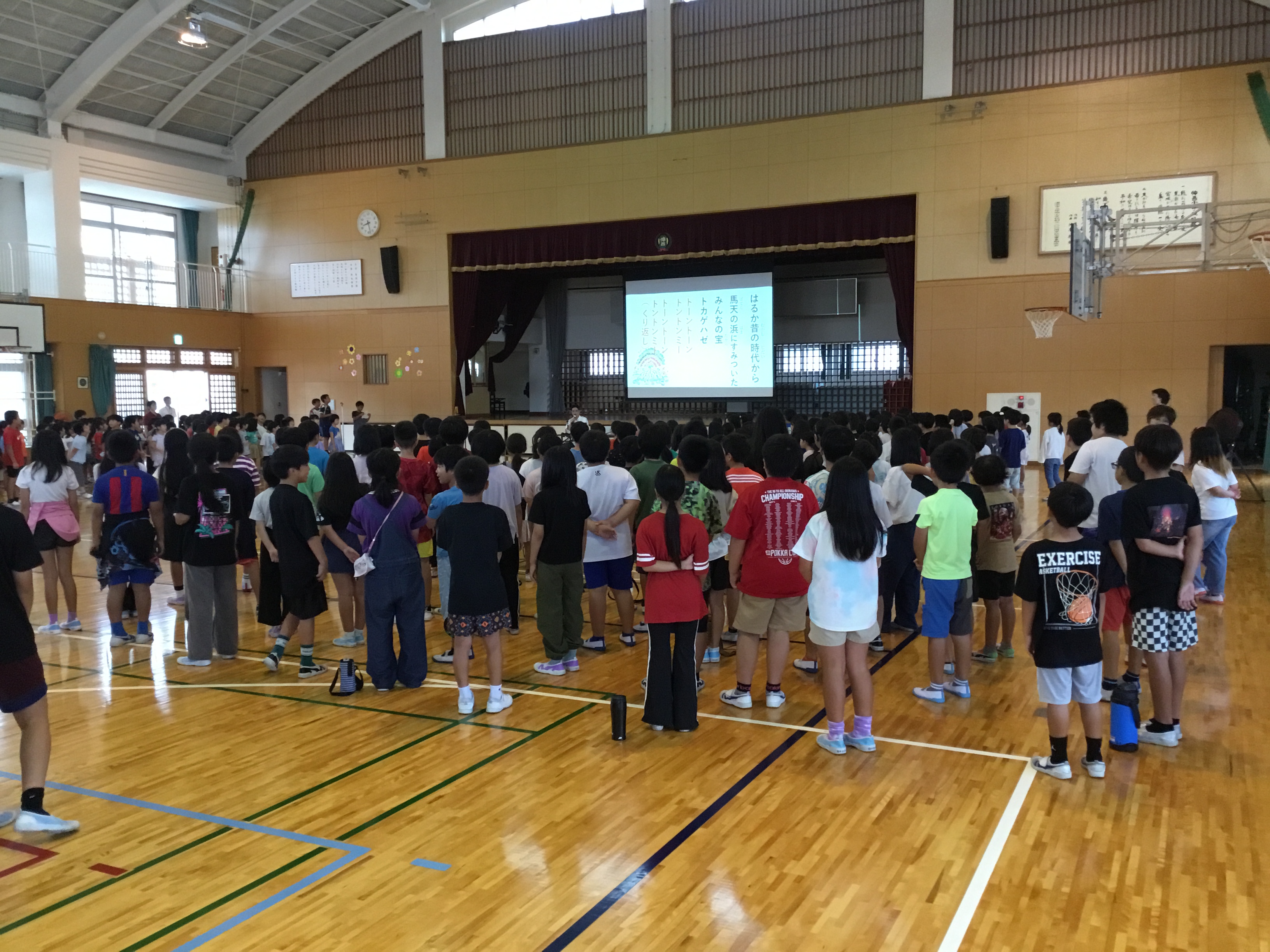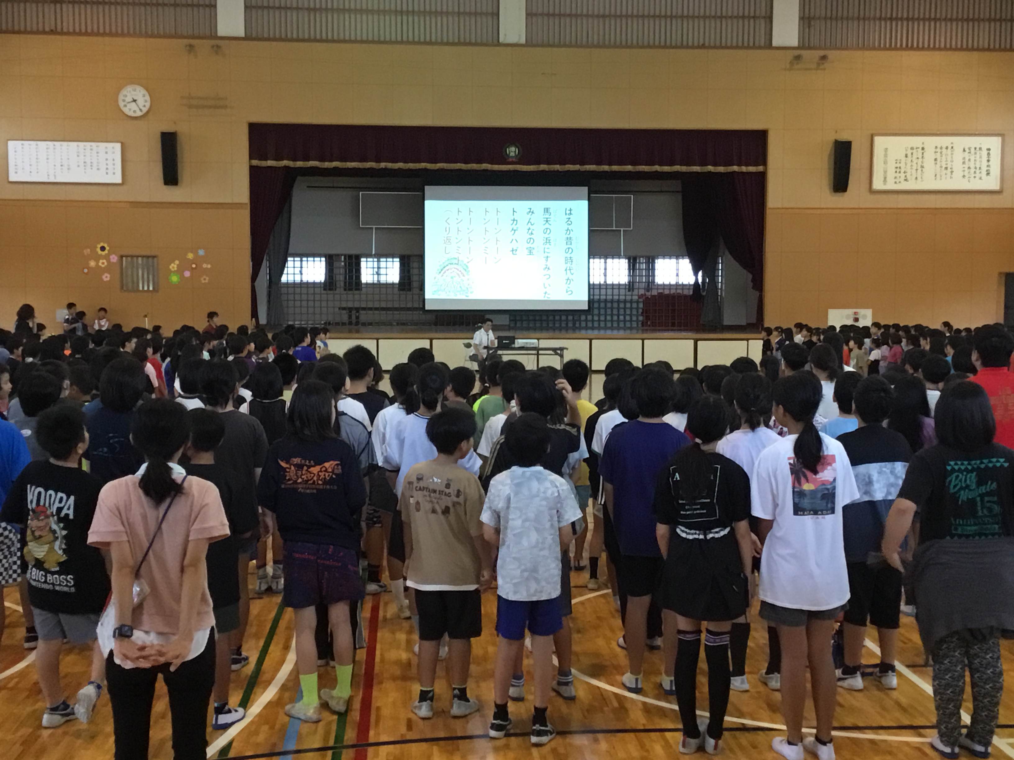 今日の音楽朝会では、沖縄の歌「トントンミーの歌」「てぃんさぐぬ花」を楽しく歌いました。