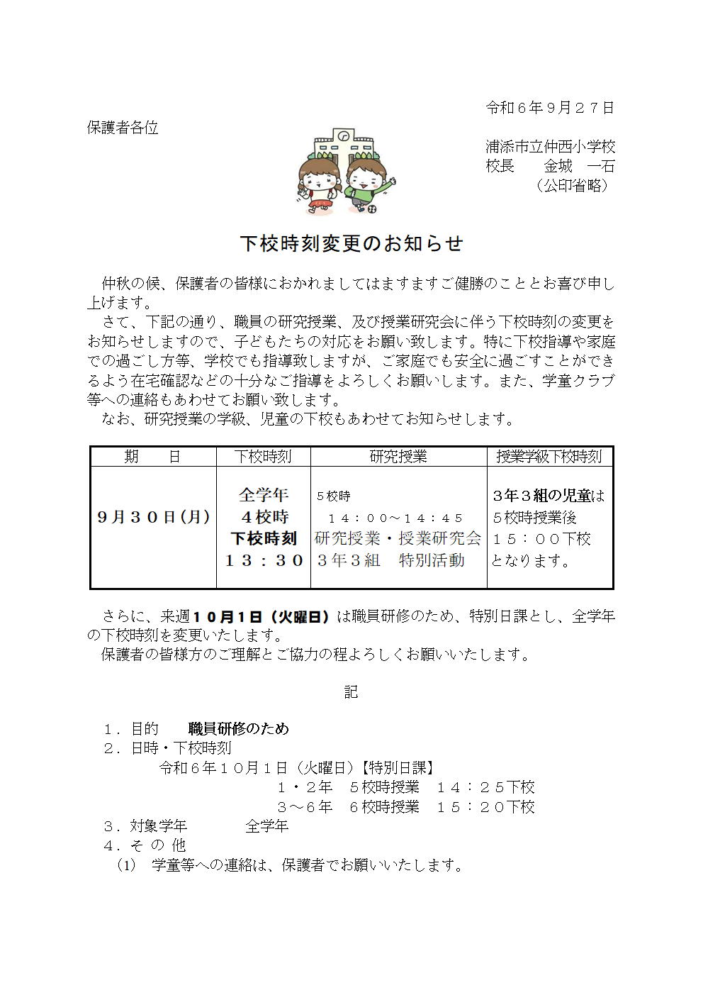 【6.9.26】下校時刻変更のお知らせ