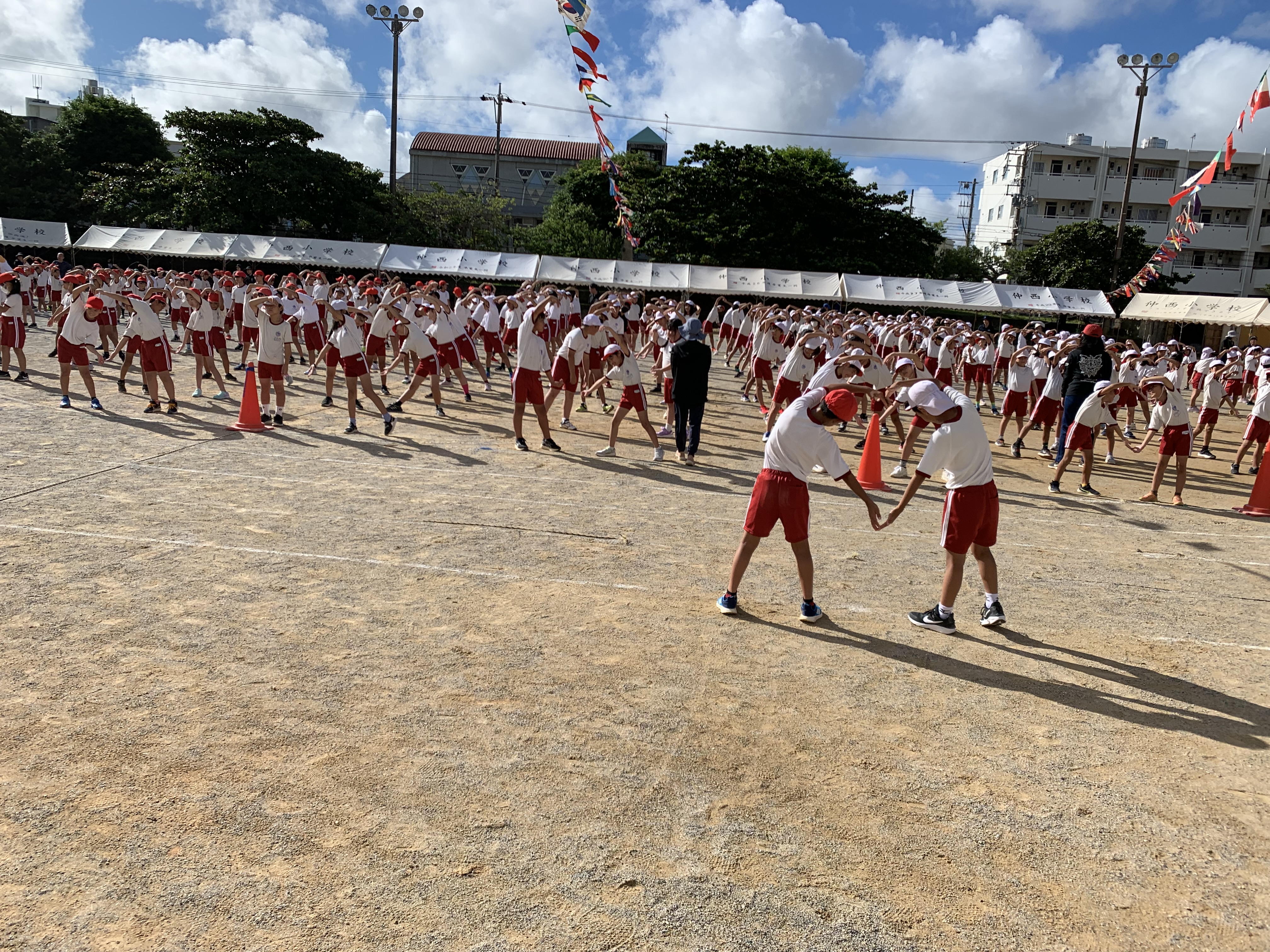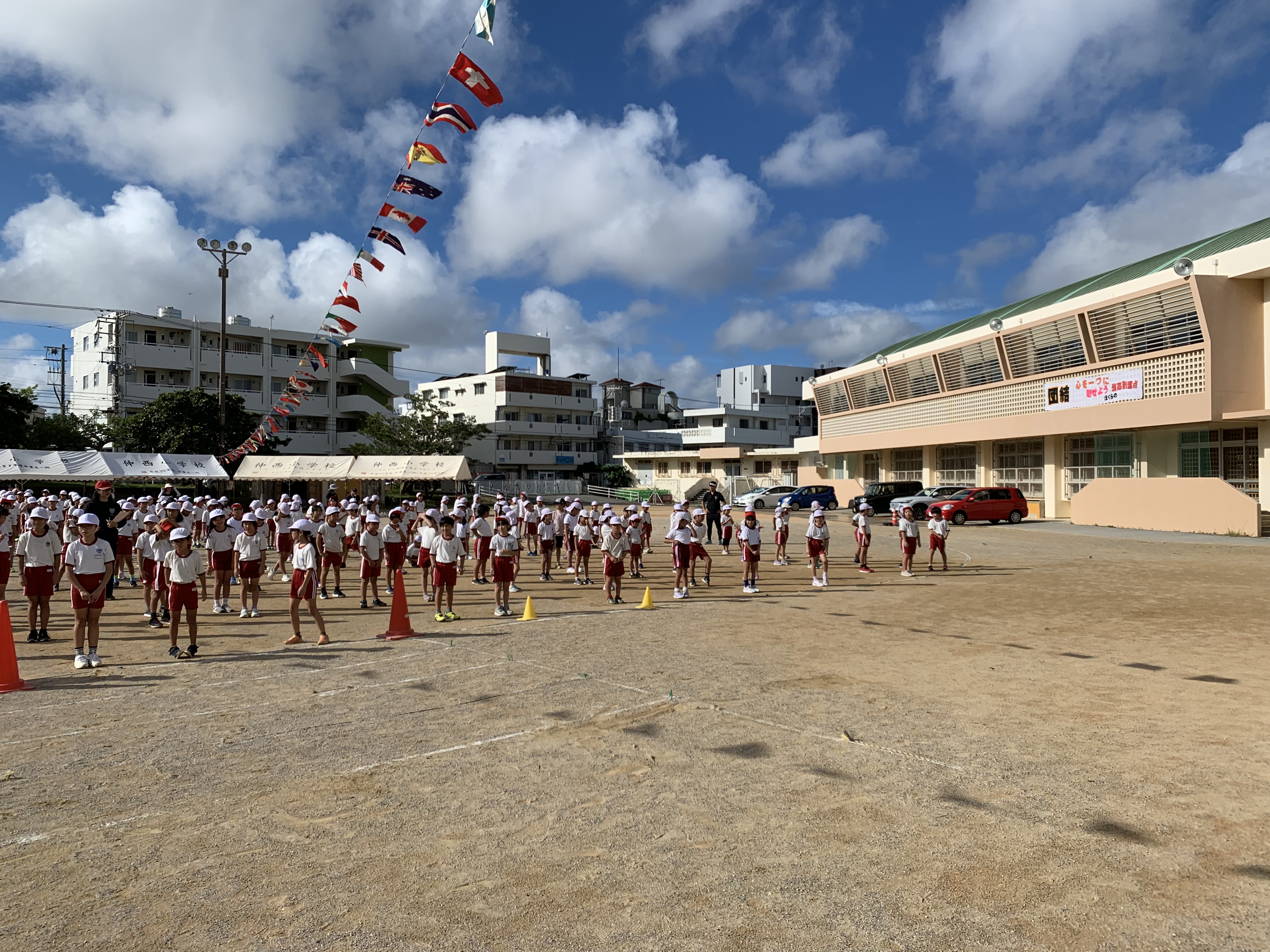 あさっての運動会に向けて、昨日は2回目の全体練習が行われました。テントがたてられ、万国旗がたなびき、テーマが掲げられました。雰囲気も盛り上がってきています。参加できない学級もありましたが、一生懸命ZOOMで授業を受けていました。今日から全学級そろっています。あさっての本番楽しみです。