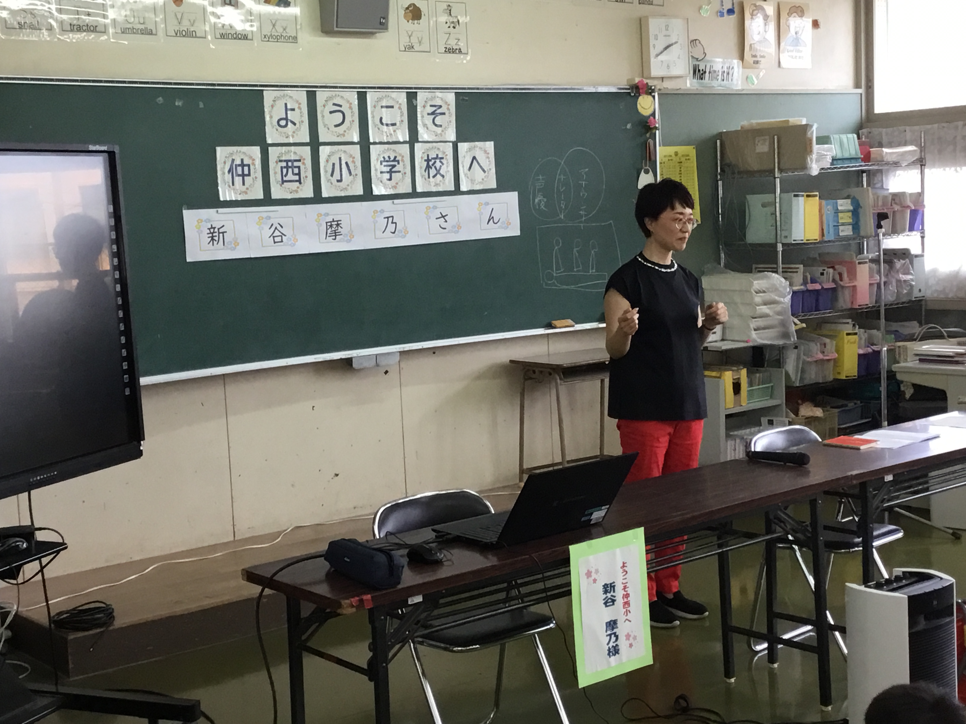 TV番組「家事ヤロウ!!!」のナレーターである新谷摩乃さんをお招きして、仲西小学校の子どもたちにナレーターの仕事についてのお話をしてもらいました。読み聞かせや給食の放送もしてもらいました。子どもたちは「TVで聞いたことがある」とはしゃいでいました。
