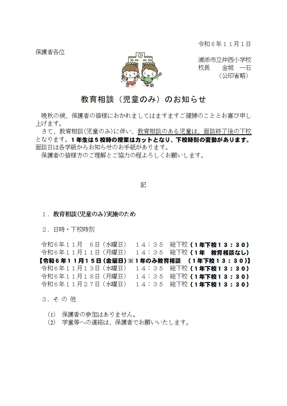 【6.11.1】教育相談(児童のみ)のお知らせ