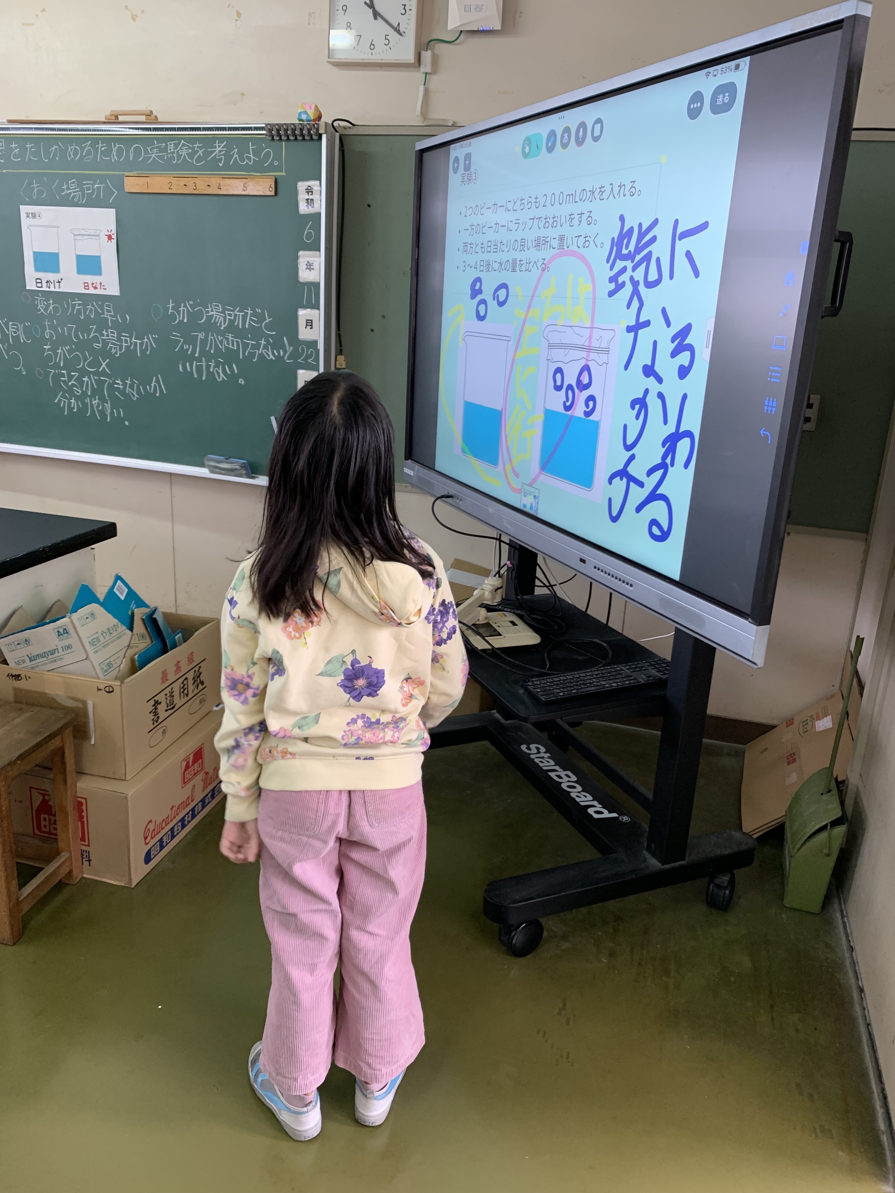 本校中堅研授業が4年理科で行われました。水は空気中に出ていくかを調べるための実験方法を、こどもたちは話し合いをしながら考えていました。