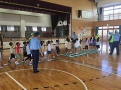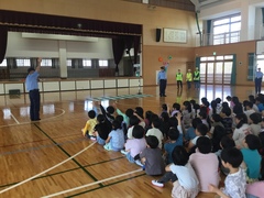 4月18日(金)浦添警察署の方をお招きして、1年生、子ども園の子どもたちと交通安全教室を実施し、横断歩道の渡り方、不審者対応、水難事故防止など多岐にわたったお話をして頂きました。
