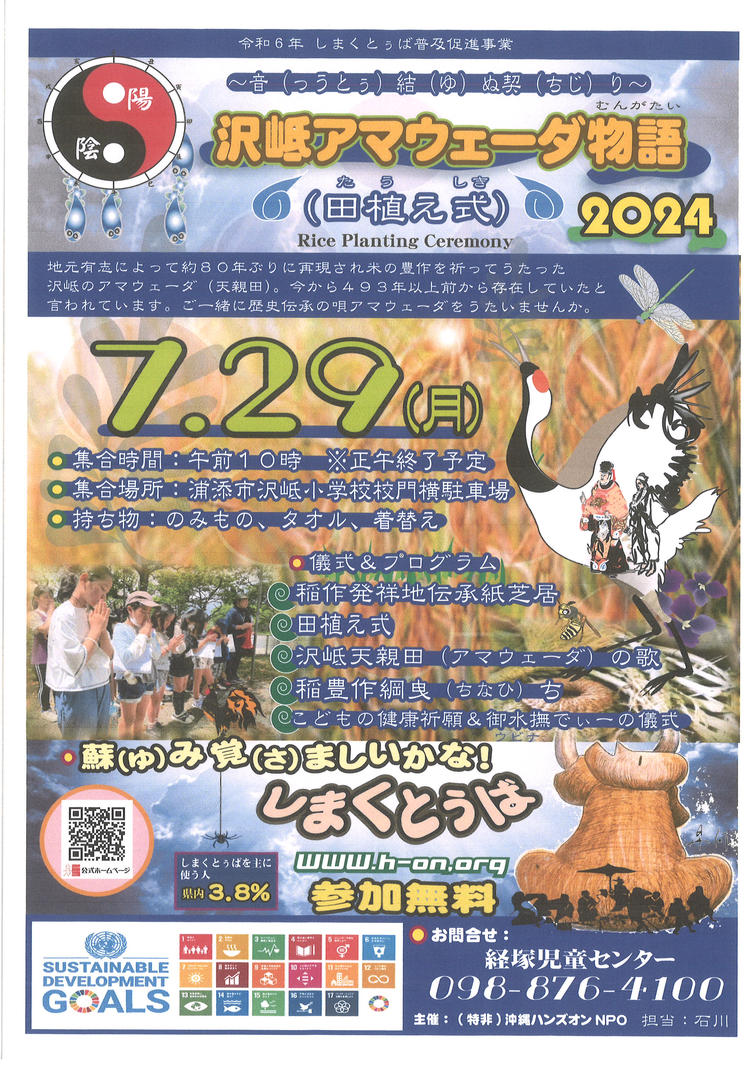 7月29日(月)午前10時から沢岻小学校の田んぼで「田植え式」が行われます。経塚児童館と地域の有志の方々の指導のもと、沢岻地域に昔から伝わる「アマウェーダ」のうたの中にあるお米づくりのヒントを利用して、沢岻小学校の「風水人クラブ」の子ども達で田んぼ作りを進めてきました。そして、29日にいよいよ田植え式が行われます。興味のある方は、どうぞご観覧下さい。