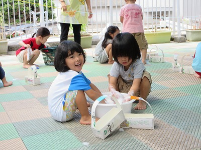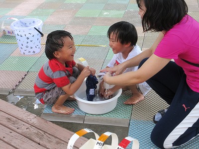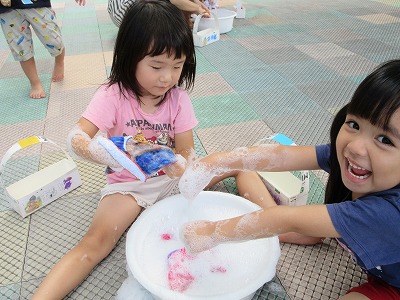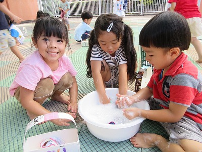水や石けんの感触を楽しみ、自分を洗って涼しくなった子もいました😊