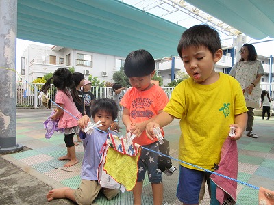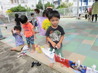 すすいだ後は、なりきって「パンパン叩いて干すんだよ」と子どもたち😊