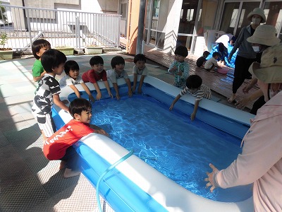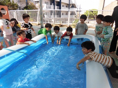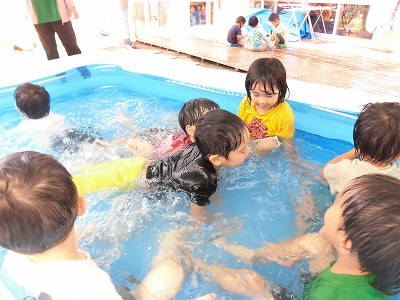 最初はプールの周りを囲んで手や頭から徐々に水をかけていきました💦
