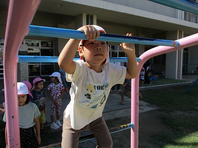 こども園に出かけた際には主に、うんてい棒やのぼり棒、ブランコの一人こぎに挑戦していますよ。引き続き、戸外での遊びを楽しんでいきたいと思っています♪