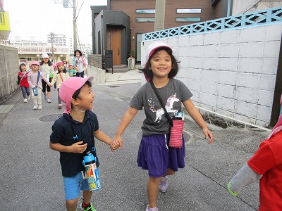 最近は、年下児との散歩も楽しんでいます。「くるまがわ(車道側)は、おおきい子が歩くんだよね~」とエスコートする姿が見られたり、積極的に話しかけ会話を楽しんだりしながら、手を引いて歩いてくれる頼もしいほしぐみさんです。