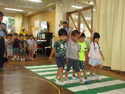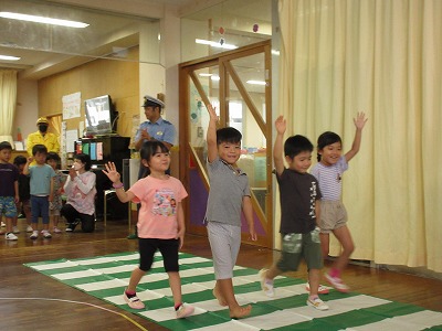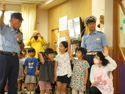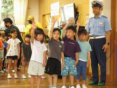 浦添警察署の方が保育所にきて、交通安全について教えていただきました。