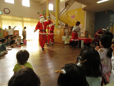 クリスマスツリーの前に集まって「あわてんぼうのサンタクロース」を歌ったり、ジングルベルに合わせて踊ったしていると、鈴の音が聞こえてきて・・・サンタさんが登場!!