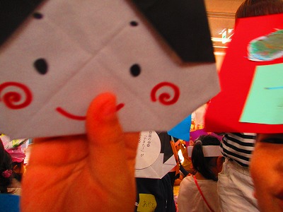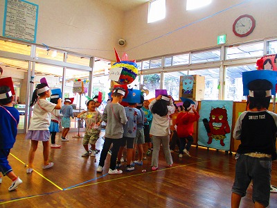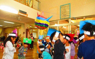 今年の豆まきは、各クラスで作った鬼に向かってどの子も、自分の中の泣き虫鬼や食いしんぼ鬼、おこりんぼ鬼、他にもいろいろな鬼を思い浮かべながら、「おにはそとー!!」と鬼に新聞紙で作った豆を投げていましたよ。ほし組はピニャータ鬼(メキシコのくす玉人形)を作り、それに向かい一生懸命豆を投げ、割れたピニャータから降ってきた福の神の折り紙を拾い集め、そこに書かれたメッセージをお友達と見せ合いっこしていた子どもたちでした。